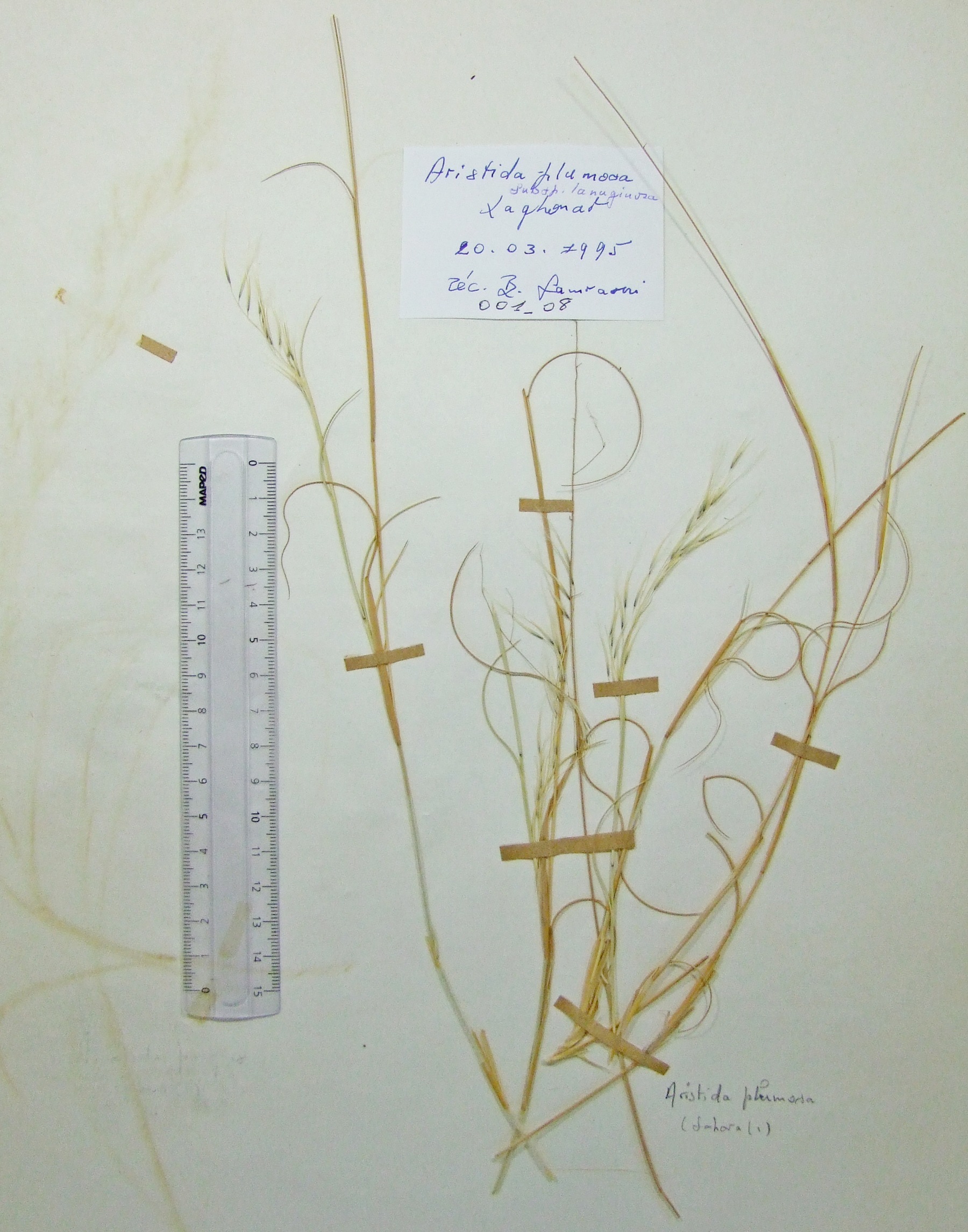 | 001_08 | Poaceae Stipagrostis plumosa (L.) Munro ex T. Anderson subsp. seminuda | x=2.943528 y=30.468767 z=395 m | El Menaa 2 Ghardaïa 1995-03-20 |  |