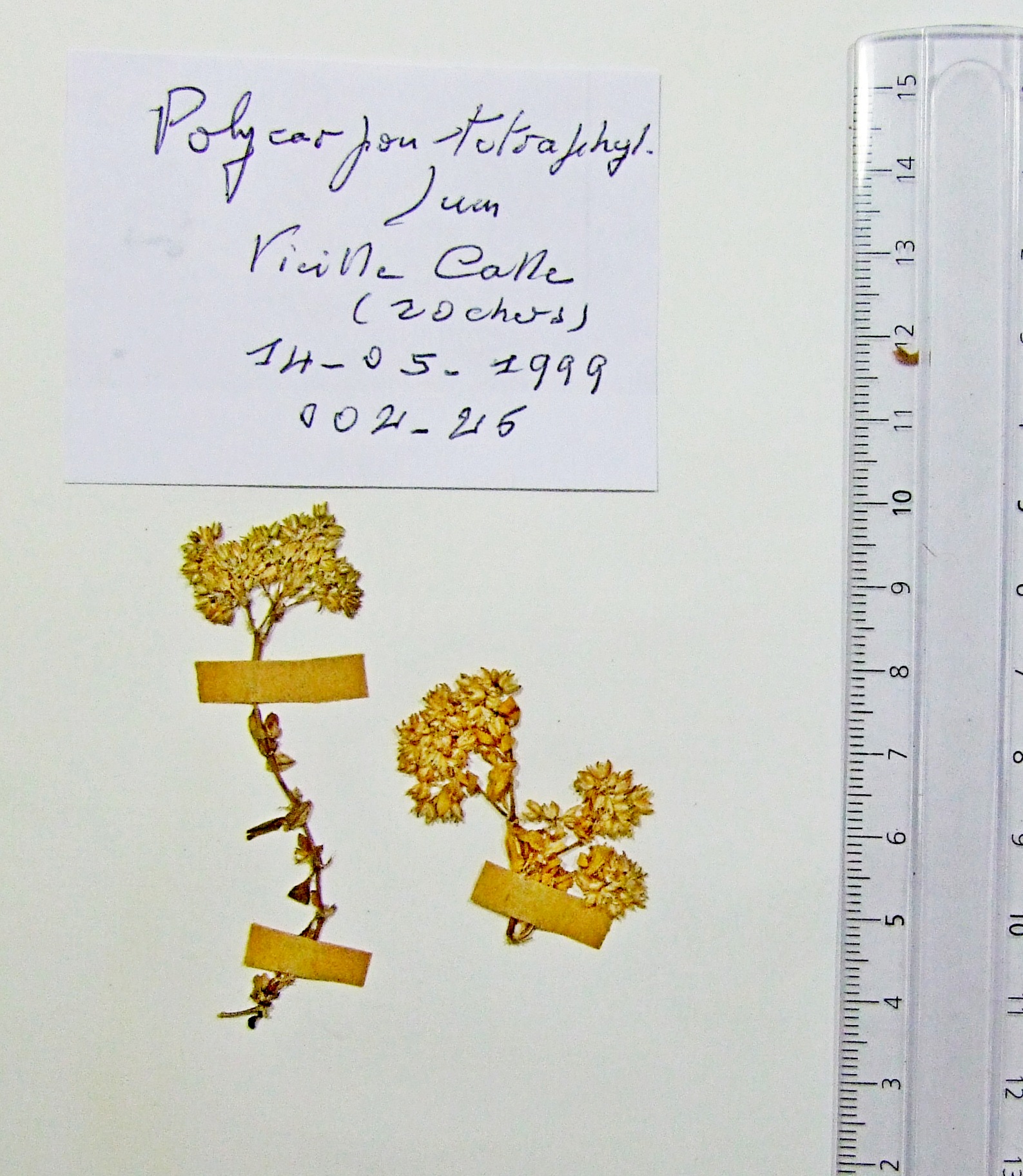 | 002_26 | Caryophyllaceae Polycarpon tetraphyllum (L.) L. | x=8.340664 y=36.917242 z=3 m | Vieille Calle El Tarf 1999-05-14 |  |