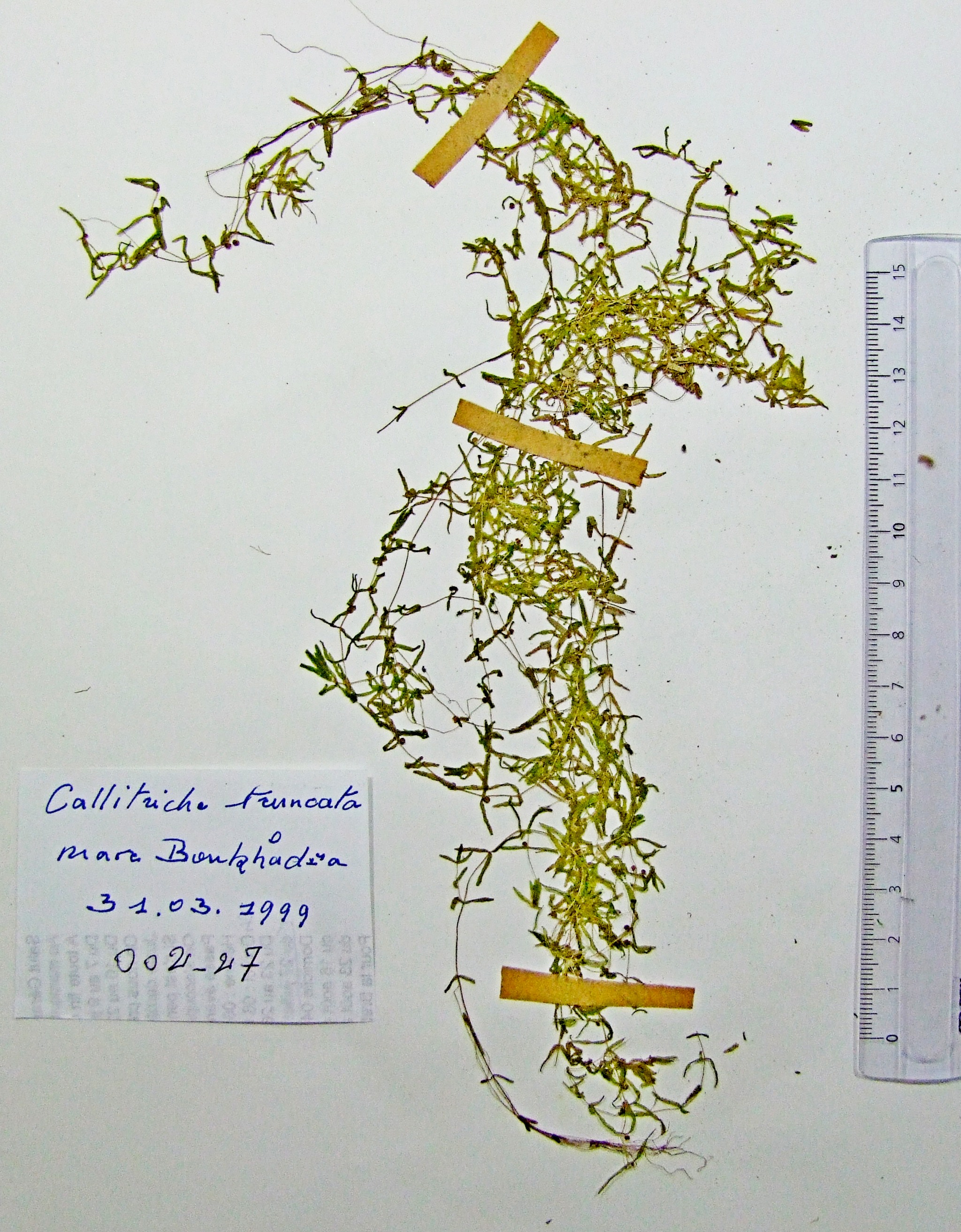 | 002_27 | Plantaginaceae Callitriche deflexa Hegelm. | x=7.739572 y=36.880169 z=1 m | mare Boukhadra Annaba 1999-03-31 |  |