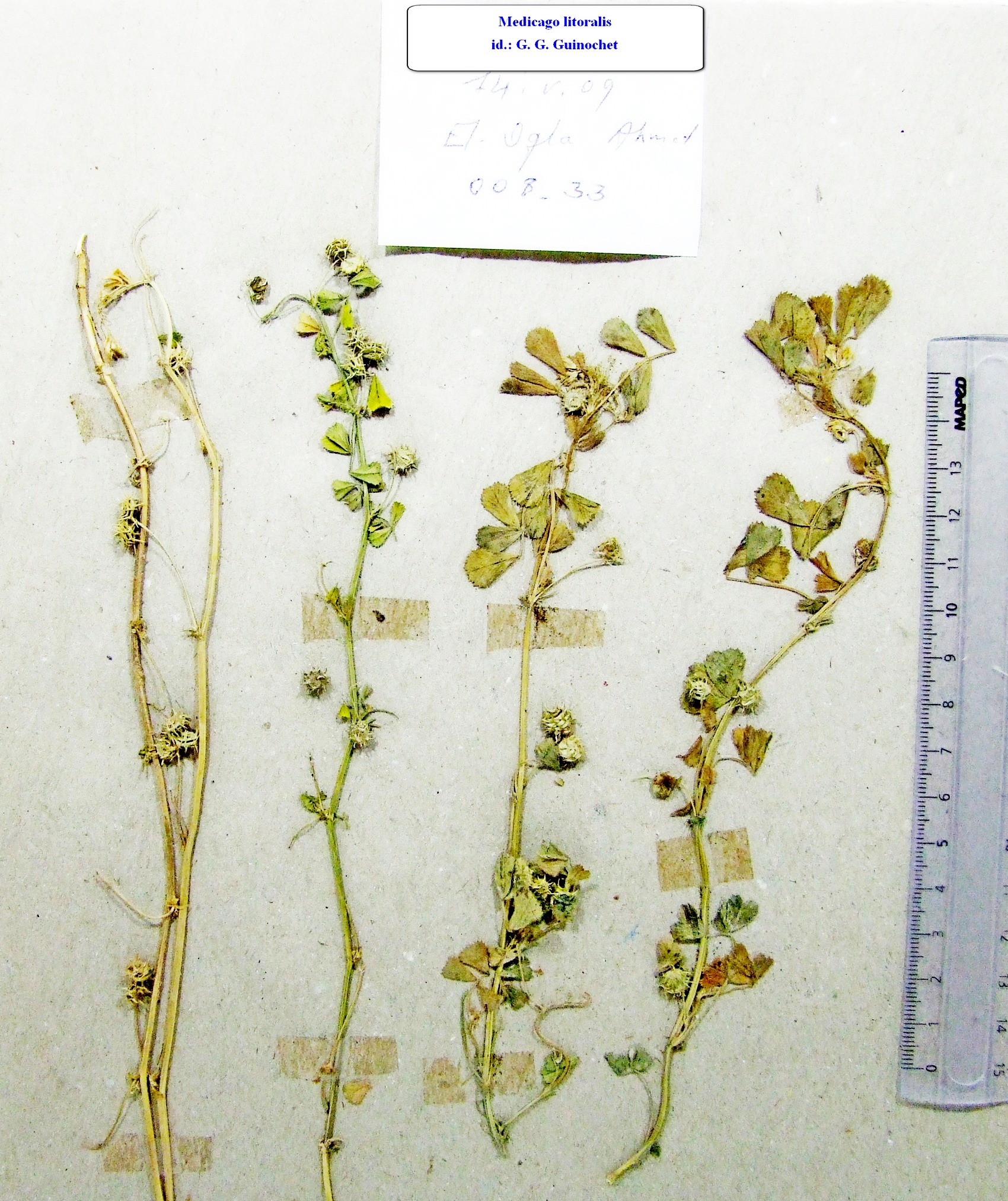 | 002_17 | Leguminosae Medicago littoralis Loisel. | x=7.292436 y=36.89125 z=24 m | garaet Bouina Skikda 1997-04-11 | |