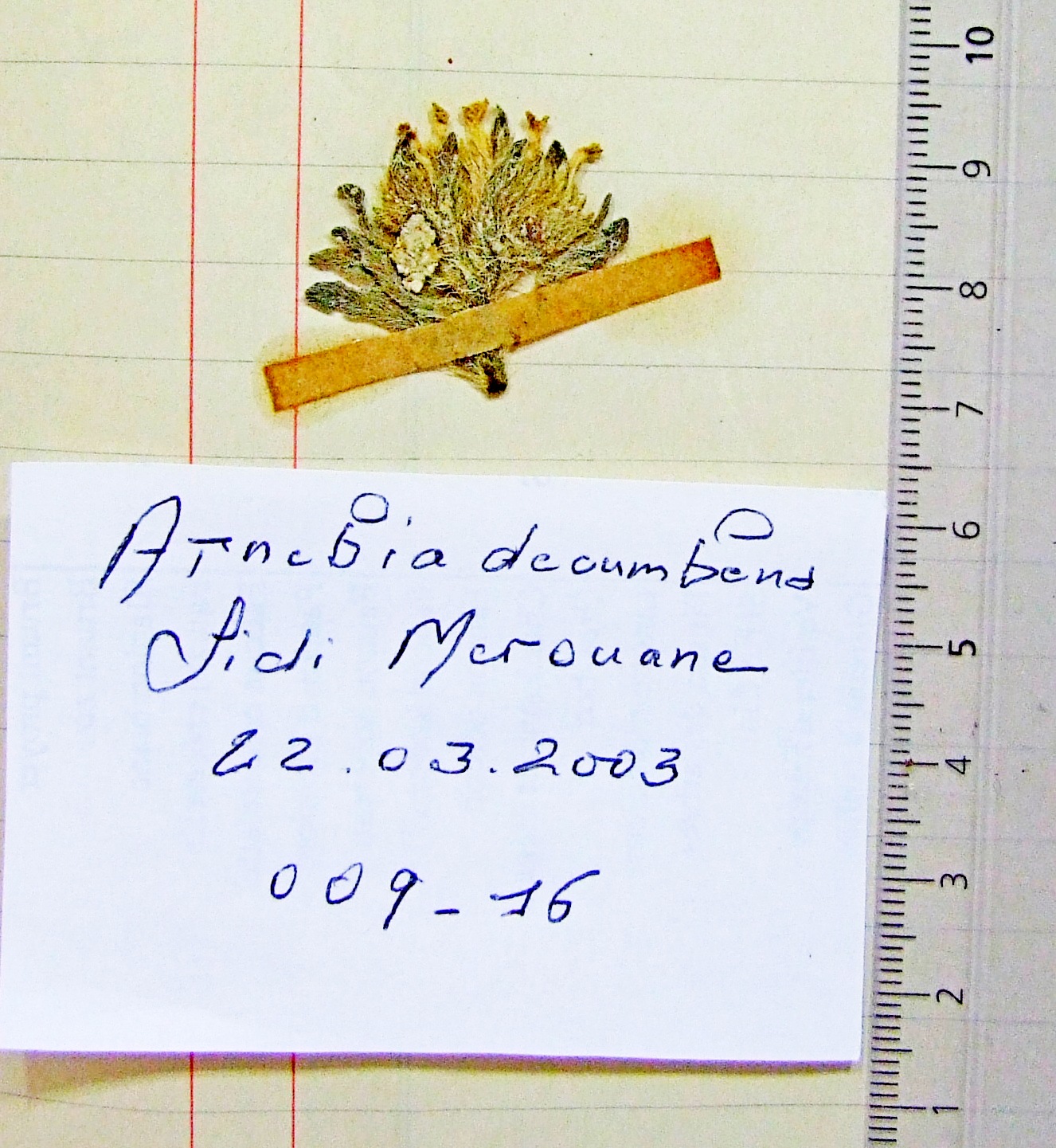 | 009_15 | Boraginaceae Arnebia decumbens (Vent.) Coss. & Kral. | x=2.943528 y=30.468767 z=395 m | El Menaa 2 Ghardaïa 2003-02-20 | |