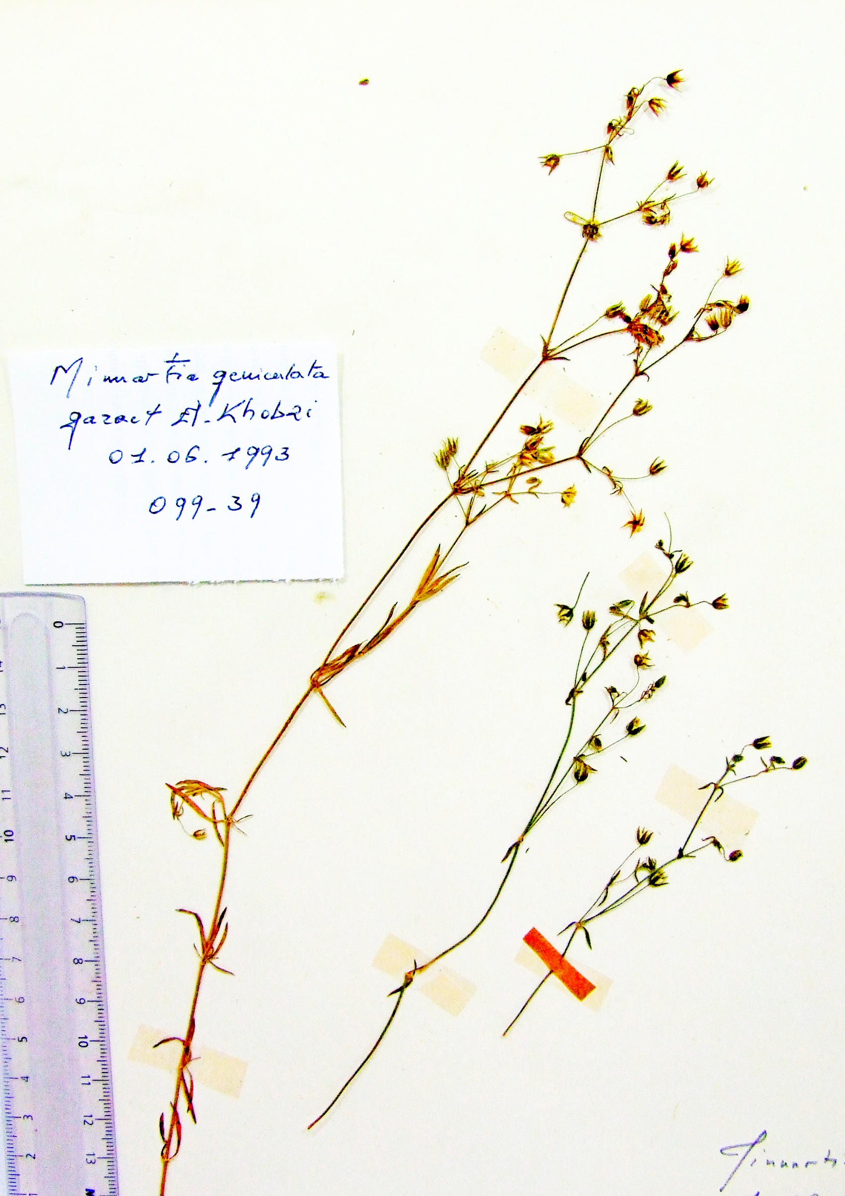 | 099_38 | Caryophyllaceae Rhodalsine geniculata (Poiret) F.N.Williams | x=7.234264 y=36.945653 z=58 m | dunes Kef Fatima Skikda 1992-05-15 | |