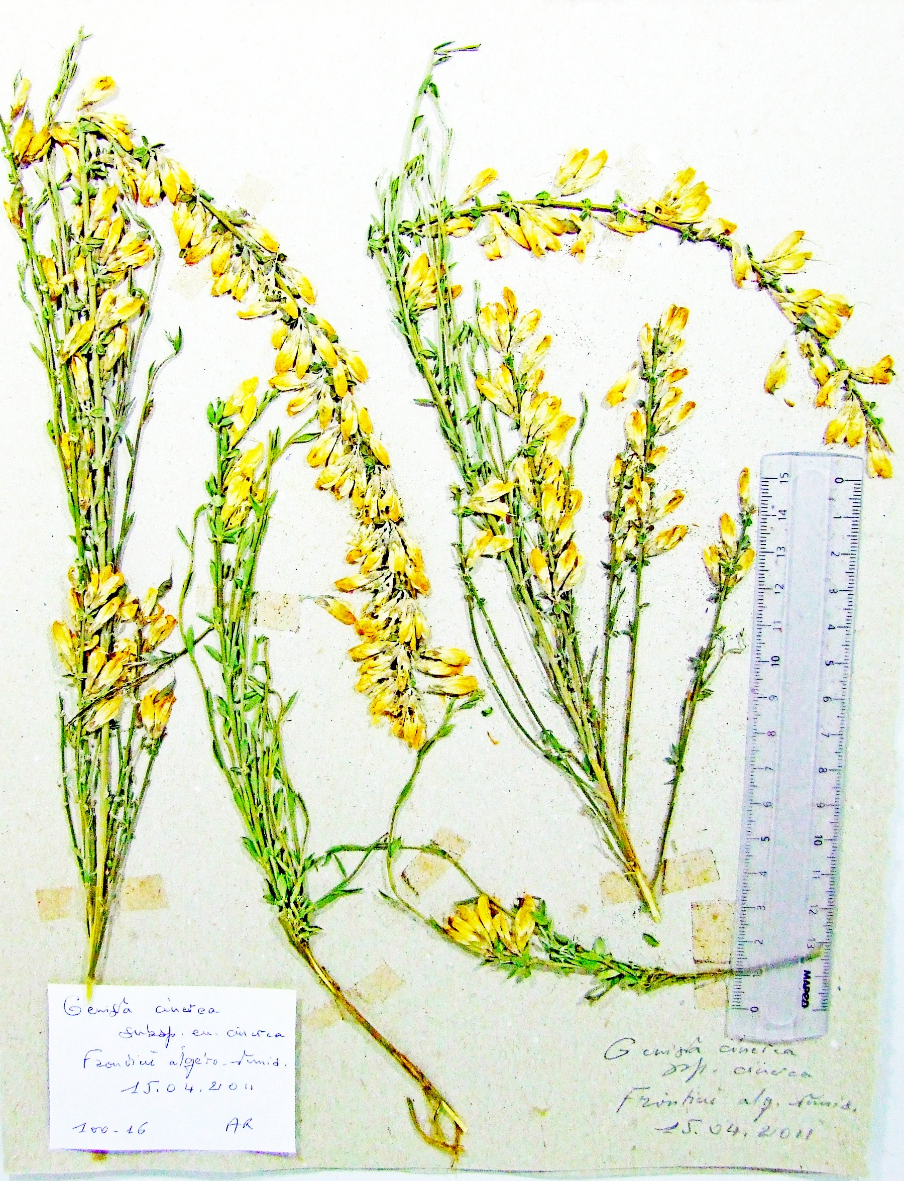 | 100_16 | Leguminosae Genista cinerea (Vill.) DC. subsp. cinerea | x=8.366 y=36.374111 z=733 m | vallée oued Medjerda Souk Ahras 2011-04-15 |  |