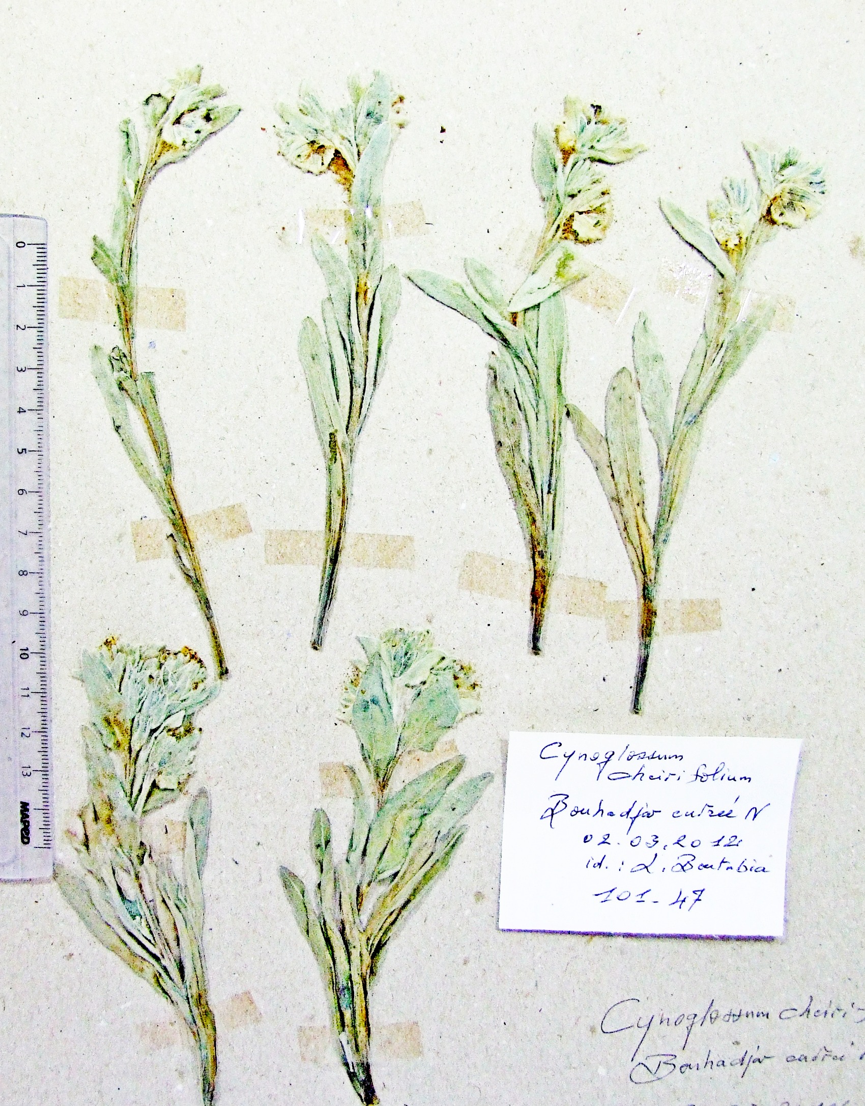 | 101_47 | Boraginaceae Cynoglossum cheirifolium L. | x=8.105092 y=36.500711 z=304 m | Bouhadjar El Tarf 2012-03-02 |  |