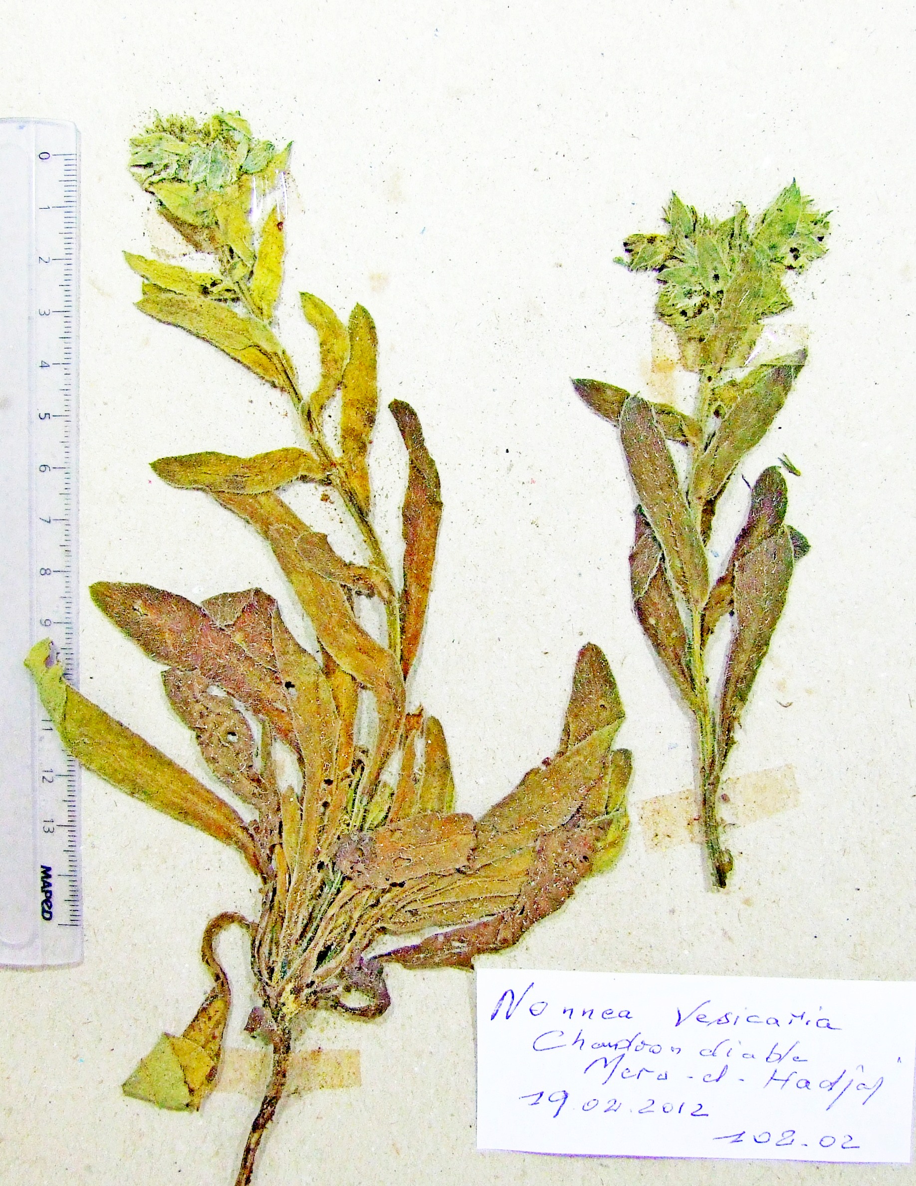 | 102_02 | Boraginaceae Nonea vesicaria (L.) Reichenb. | x=-0.168128 y=35.752778 z=82 m | Mers el Hadjaj Oran 2012-02-19 |  |