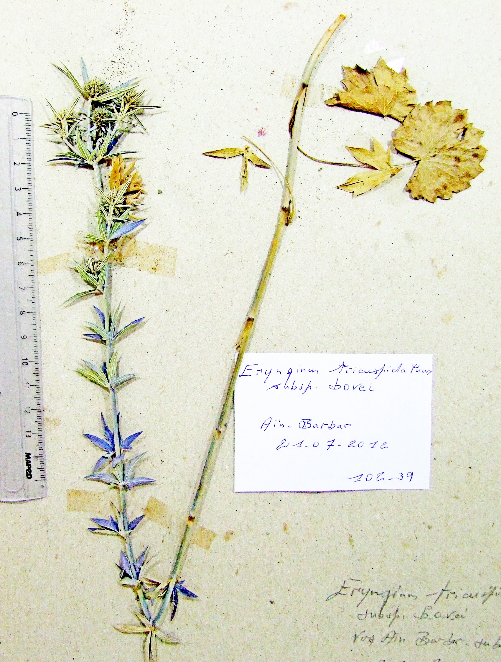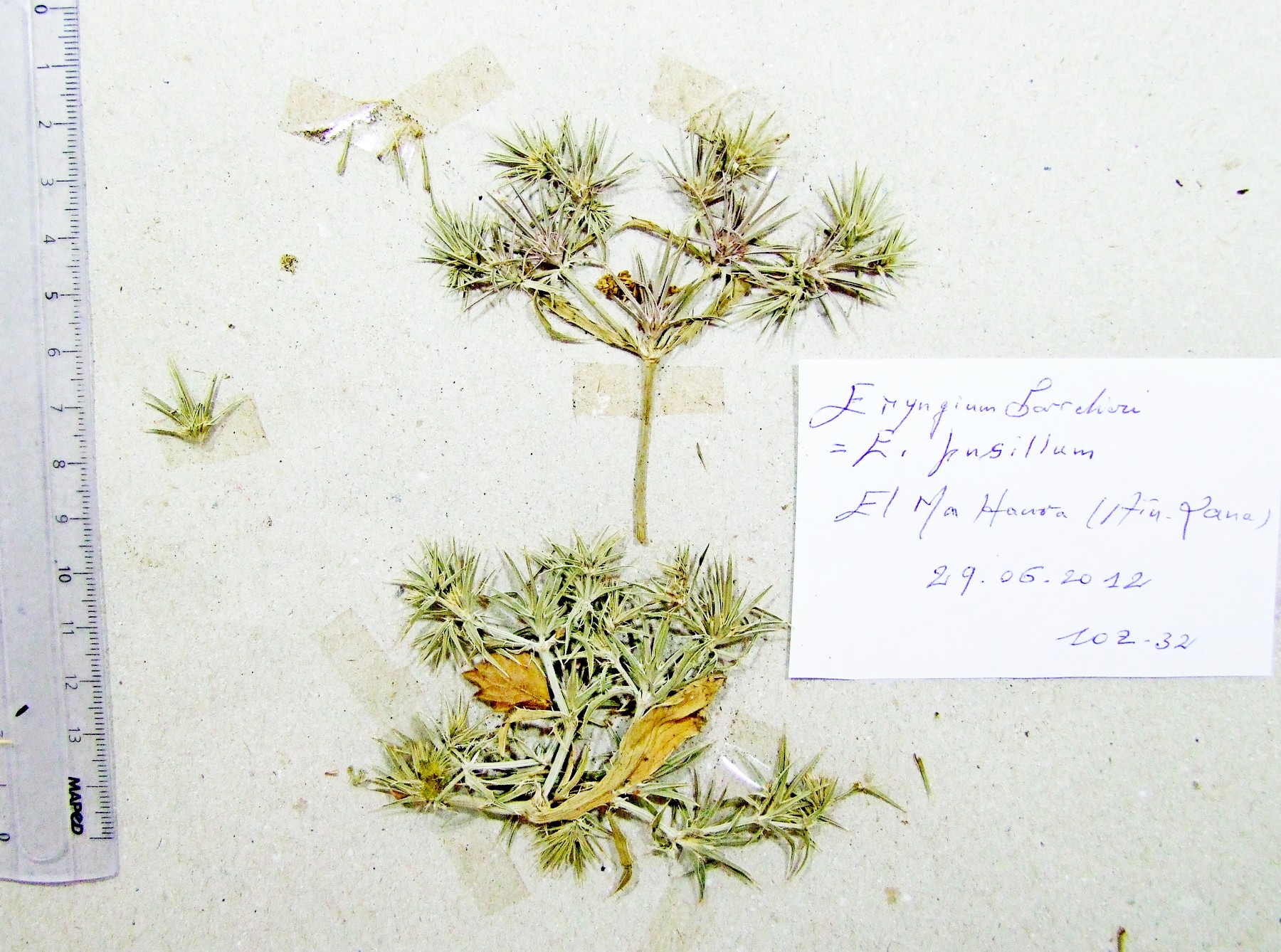 | 102_39 | Umbelliferae Eryngium tricuspidatum L. subsp. bovei (Boiss.) Batt. | x=7.593653 y=36.957339 z=352 m | djebel Edough 4 Annaba 2012-07-21 |  |