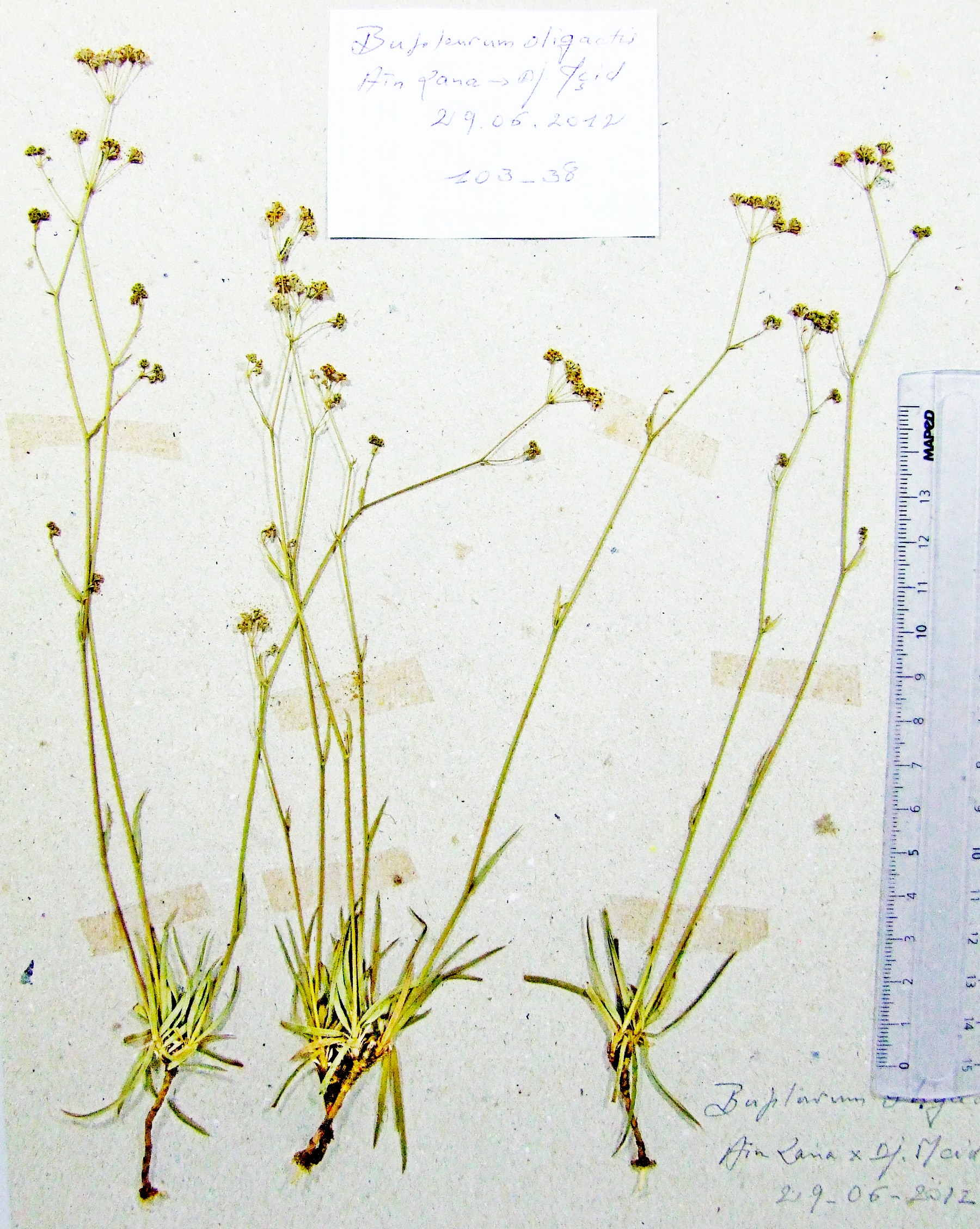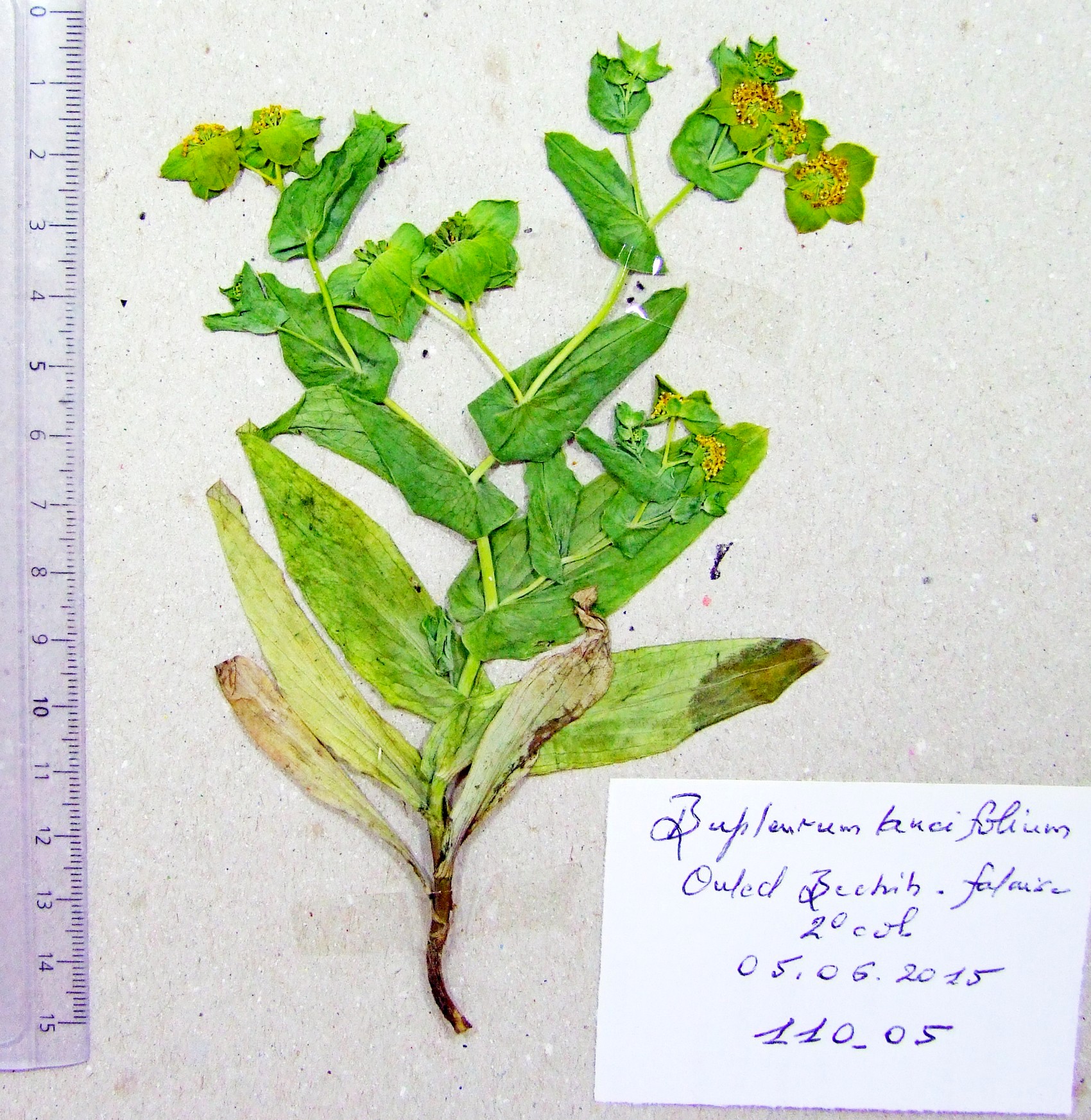 | 110_05 | Umbelliferae Bupleurum lancifolium Hornem. | x=7.890667 y=36.388278 z=994 m | Beni Salah 3 Guelma 2015-06-05 |  |