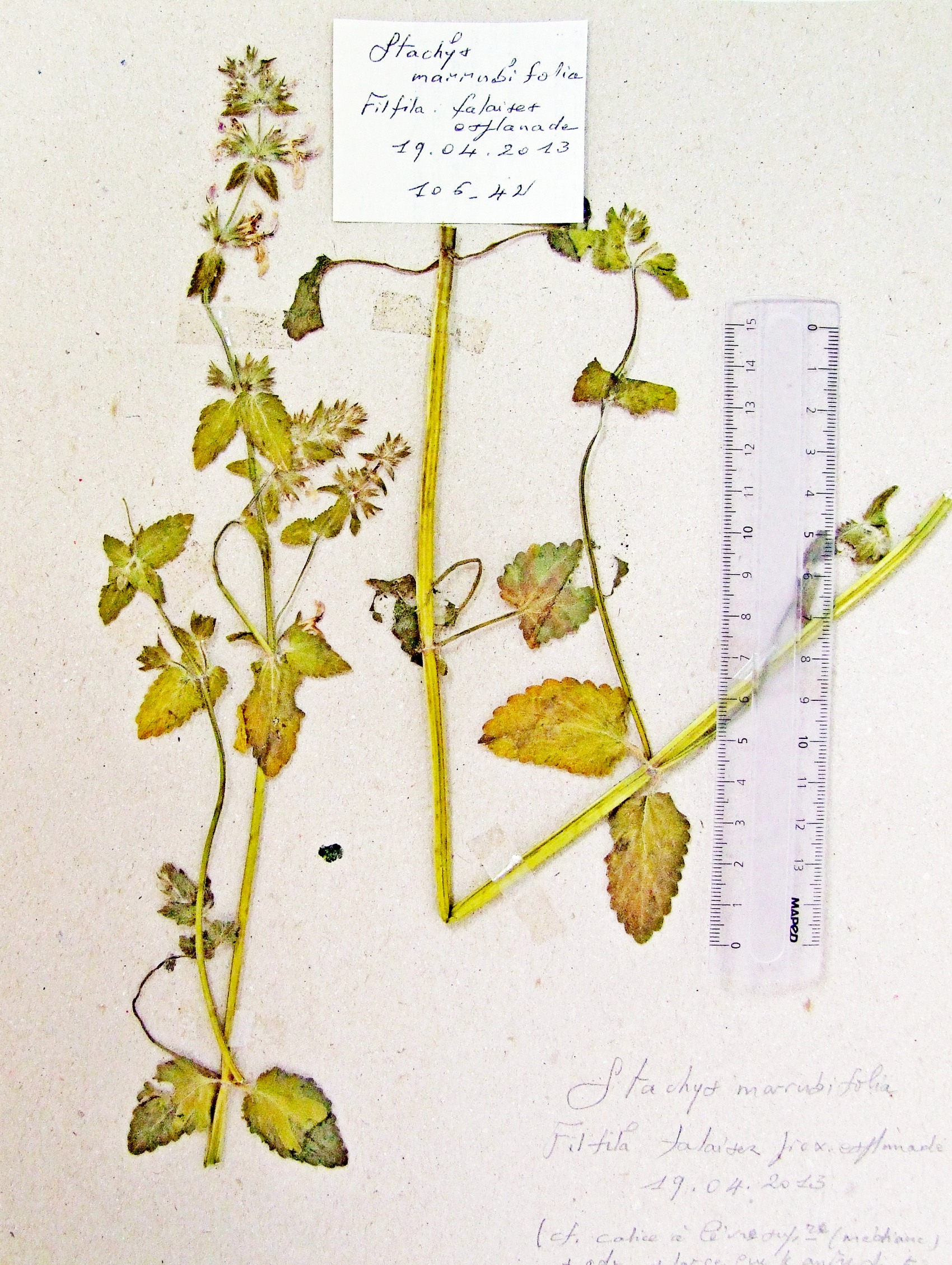 | 101_33 | Labiatae Stachys ocymastrum (L.) Briq. | x=8.347422 y=36.632803 z=400 m | djebel Ghorra (1) El Tarf 2010-05-28 | |