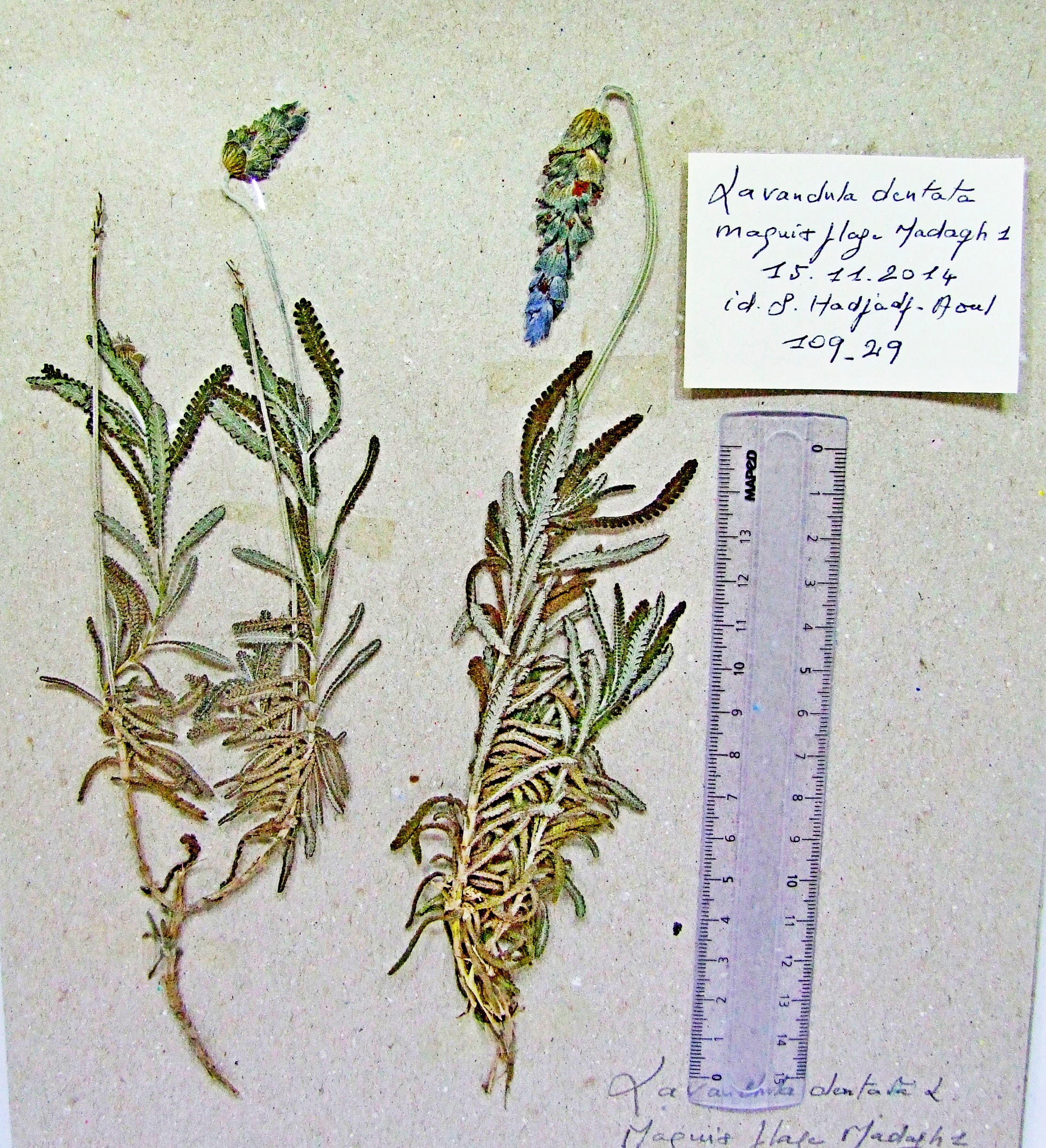 | 109_29 | Labiatae Lavandula dentata L. | x=-0.838214 y=35.692122 z=50 m | maquis madagh 1 Oran 2014-11-15 |  |