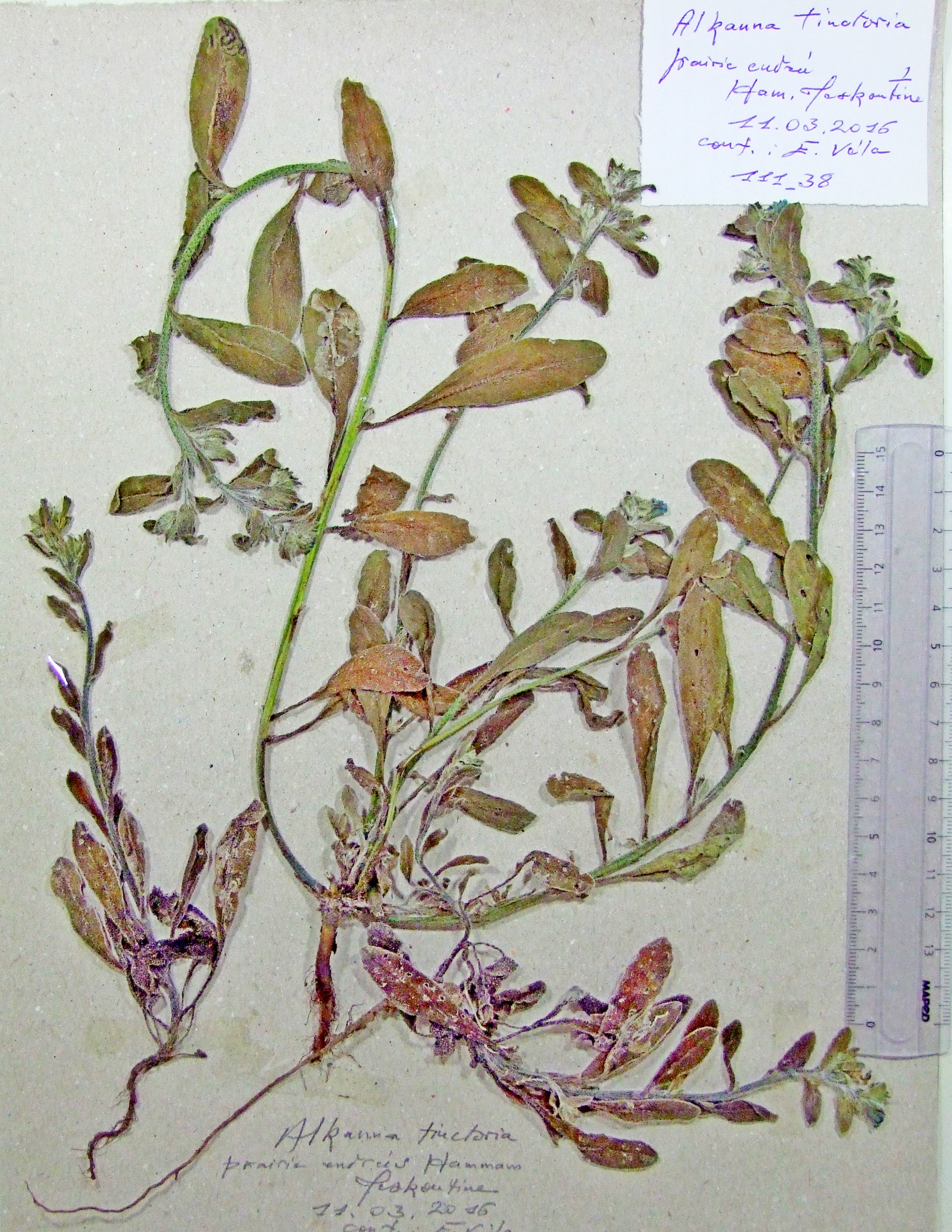 | 111_38 | Boraginaceae Alkanna tinctoria Tausch | x=7.275967 y=36.456825 z=310 m | Hammam Meskhoutine 1 Guelma 2016-03-11 |  |