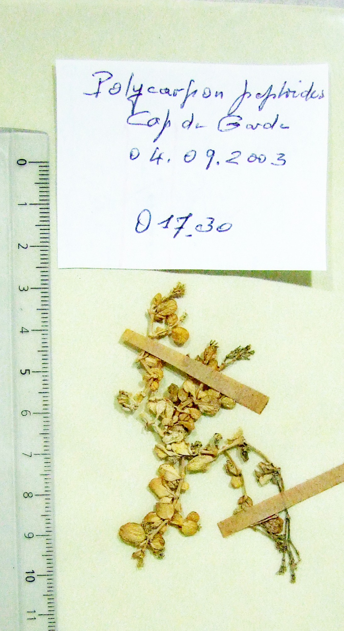 | 017_30 | Caryophyllaceae Polycarpon peploïdes (Lap.) DC. | x=7.790608 y=36.967789 z=4 m | presqu'île cap de Garde Annaba 2003-09-04 |  |