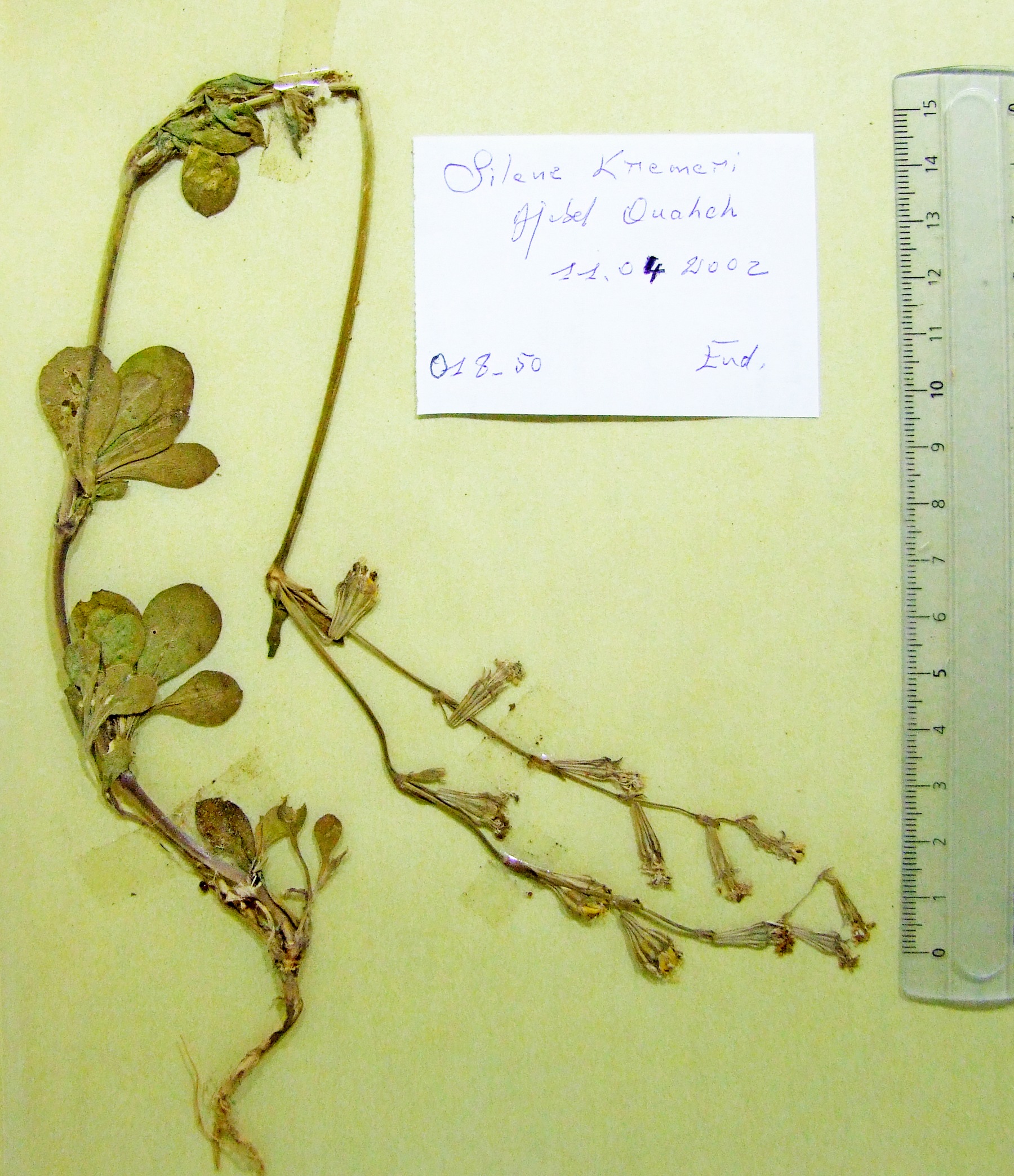 | 018_50 | Caryophyllaceae Silene kremeri S.-W. & Godr. | x=6.660578 y=36.403761 z=1009 m | djebel Ouahch 1B Constantine 2002-04-11 |  |