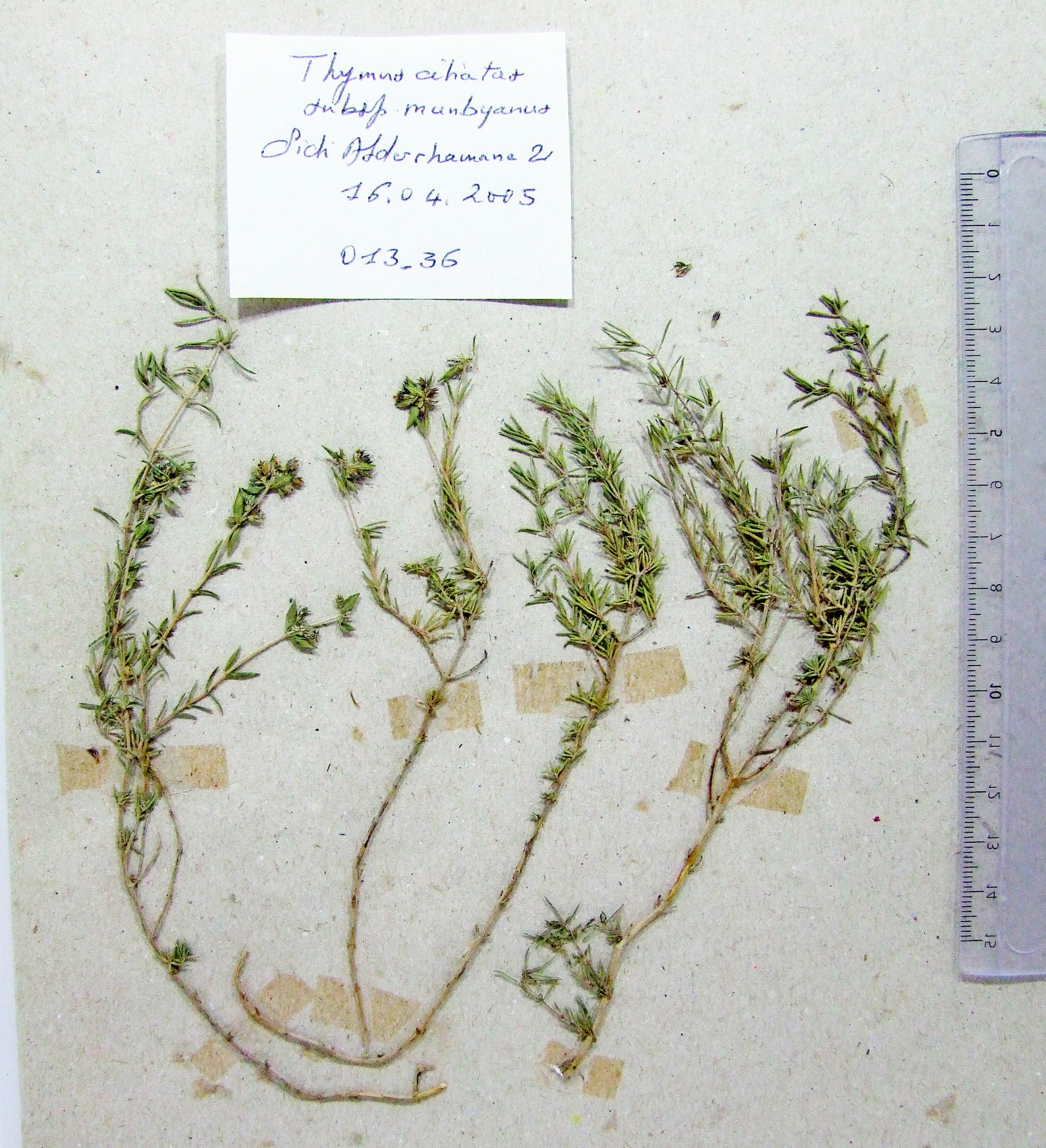 | 013_36 | Labiatae Thymus munbyanus Boiss. & Reuter subsp. munbyanus | x=8.105472 y=34.7545 z=844 m | Sidi Abderrhamane 2 Tébessa 2005-04-16 |  |