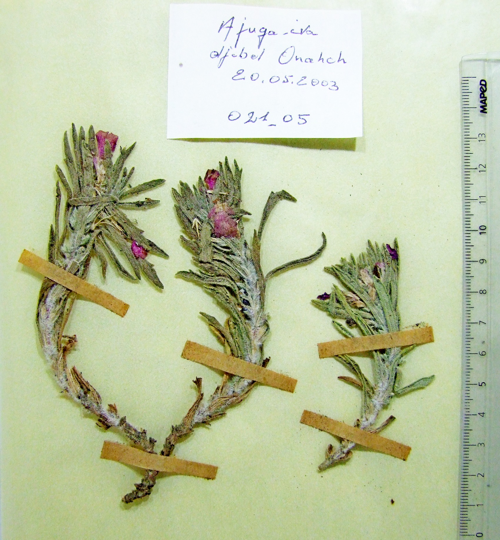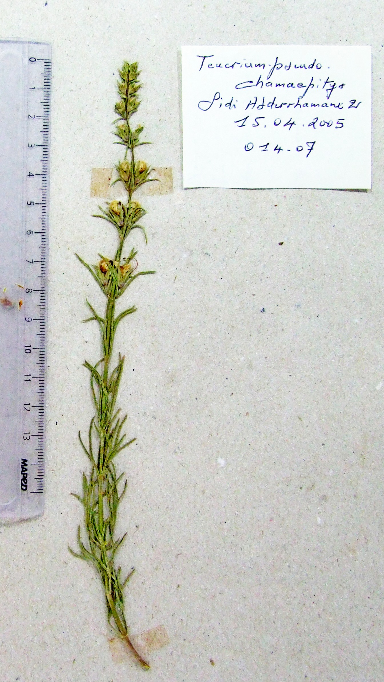| 014_07 | Labiatae Teucrium pseudo-chamaepitys L. | x=8.105472 y=34.7545 z=844 m | Sidi Abderrhamane 2 Tébessa 2005-04-15 |  |