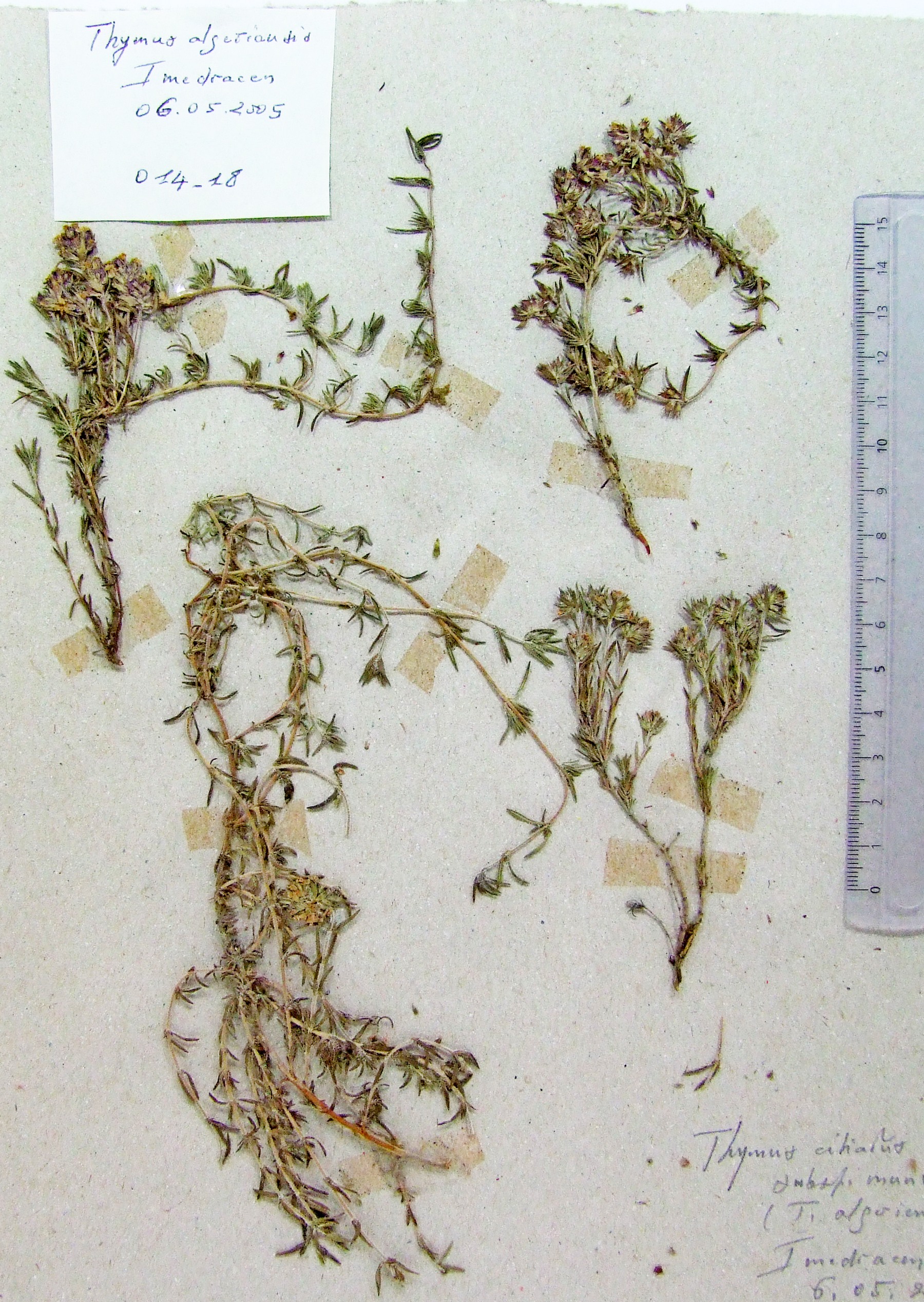 | 014_18 | Labiatae Thymus algeriensis Boiss. & Reut. | x=6.434431 y=35.706919 z=891 m | Medghacen Batna 2005-05-06 |  |