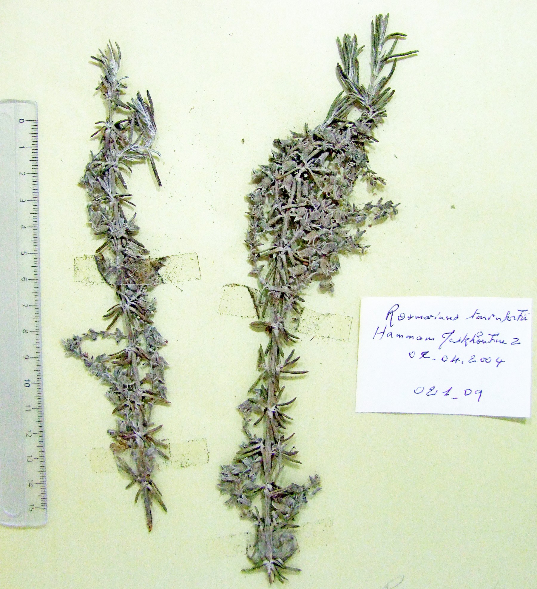 | 008_01 | Labiatae Rosmarinus officinalis L. | x=7.99975 y=36.206111 z=697 m | oued Djedra Souk Ahras 2009-03-13 |  |