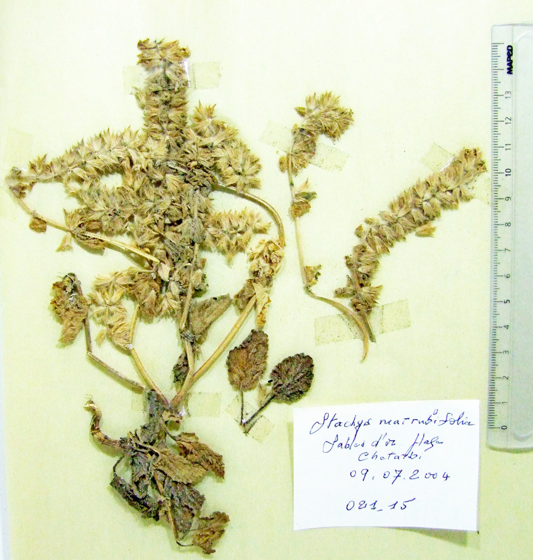 | 073_12 | Labiatae Stachys marrubifolia Viv. | x=8.06245 y=36.870681 z=22 m | dunes Draouch El Tarf 1978-04-28 |  |