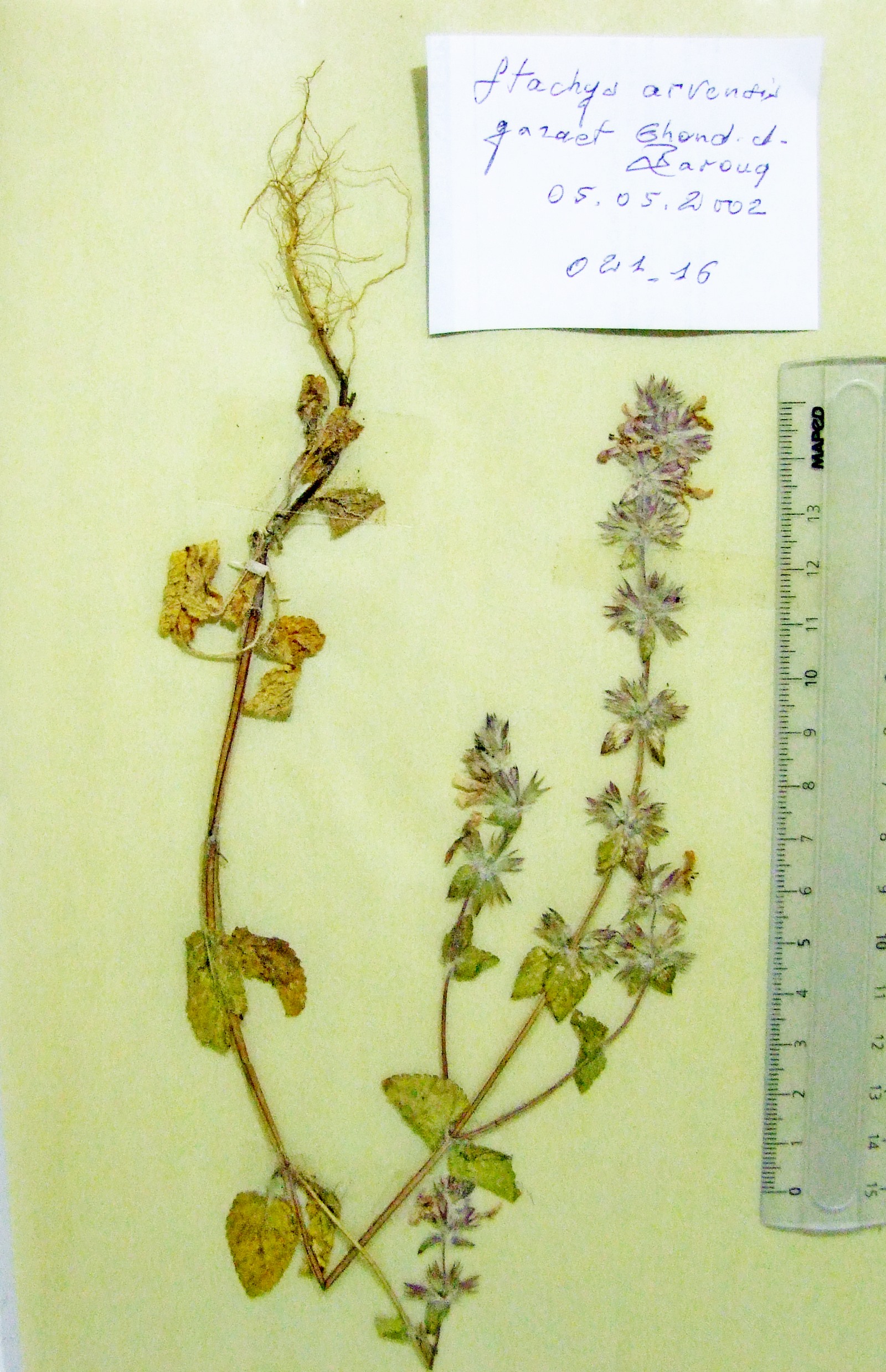 | 101_33 | Labiatae Stachys ocymastrum (L.) Briq. | x=8.347422 y=36.632803 z=400 m | djebel Ghorra (1) El Tarf 2010-05-28 | |