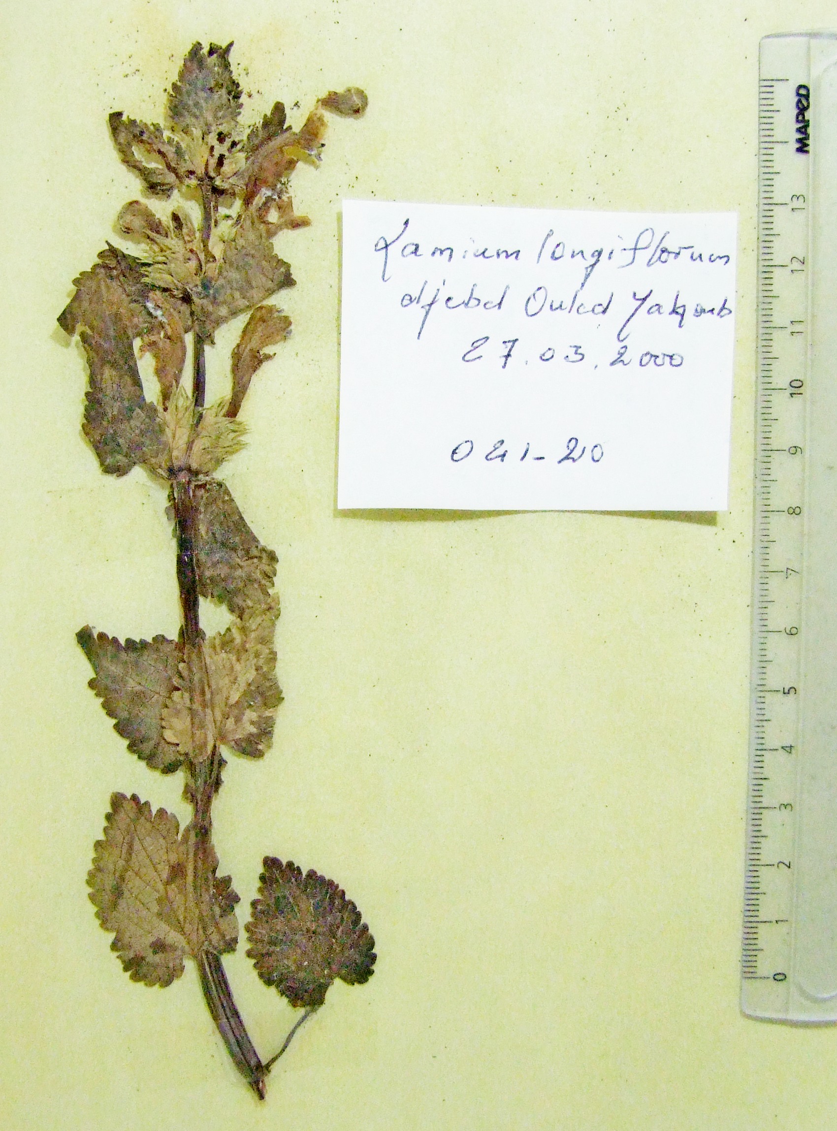 | 021_20 | Labiatae Lamium garganicum L. | x=6.980394 y=35.457664 z=1008 m | djebel Ouled Yakoub Khenchela 2000-03-27 |  |