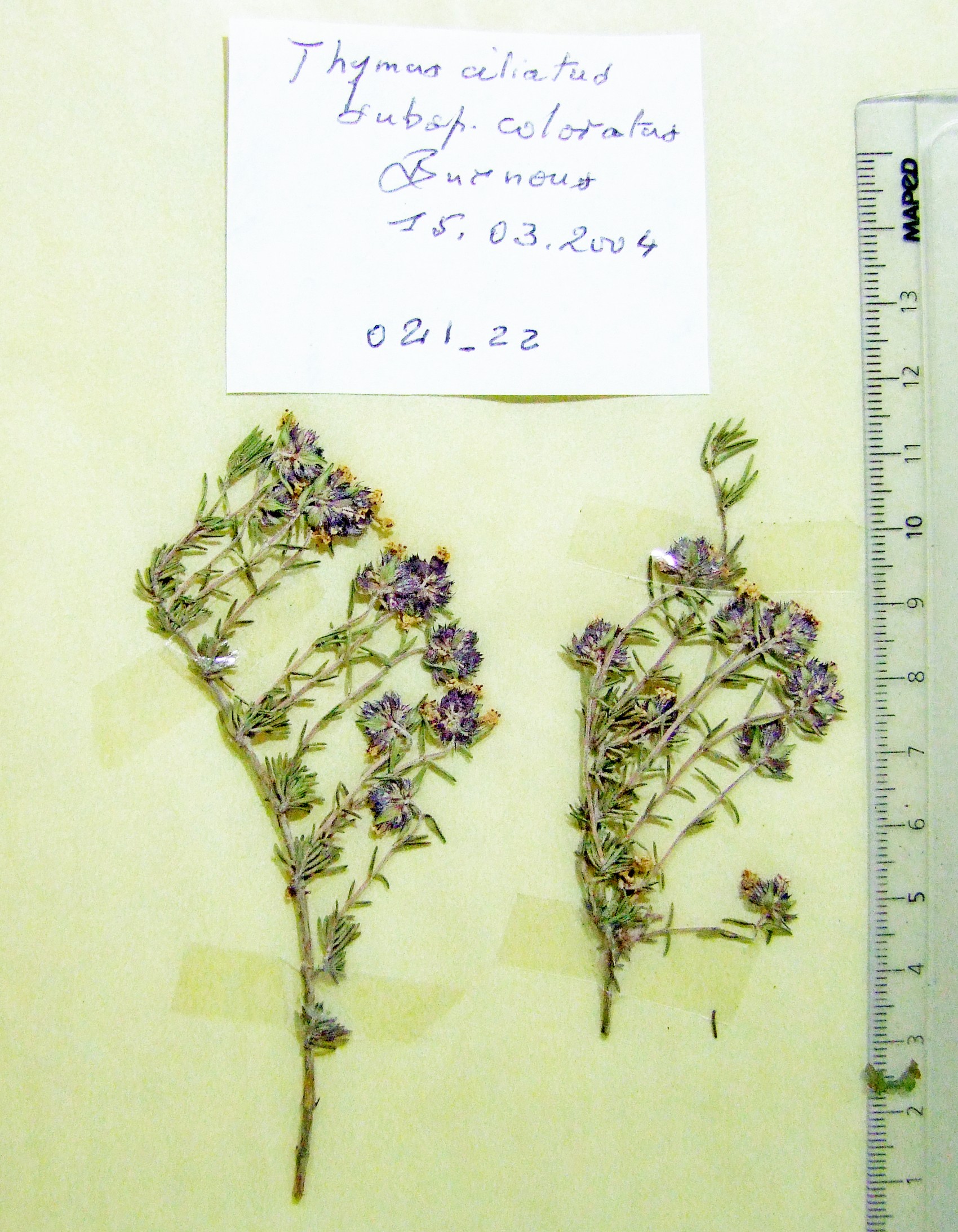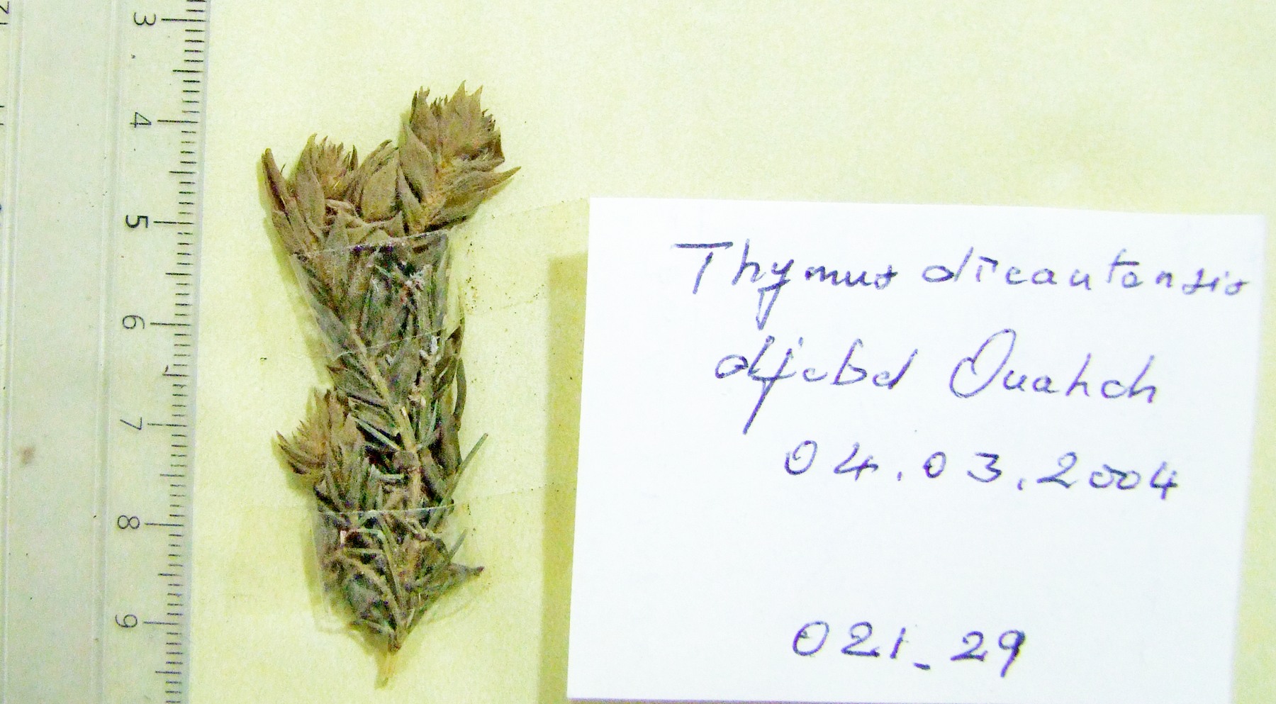 | 021_23 | Labiatae Thymus algeriensis Boiss. & Reut. | x=6.9969 y=35.962736 z=1145 m | djebel Ghodban Oum el Bouaghi 2003-03-20 | |