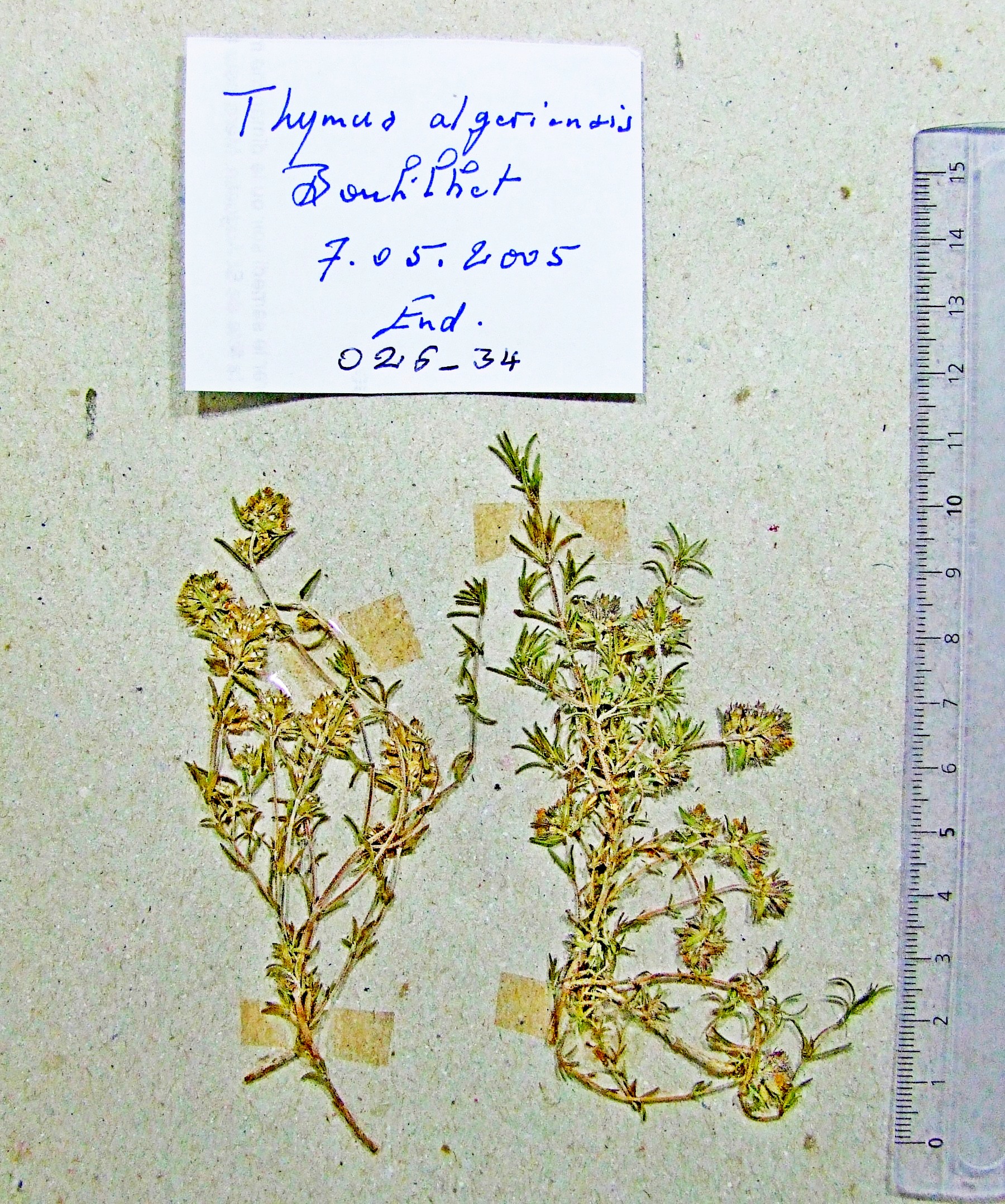 | 026_34 | Labiatae Thymus algeriensis Boiss. & Reut. | x=6.692775 y=35.731417 z=840 m | Boulilhet Oum el Bouaghi 2005-05-07 |  |
