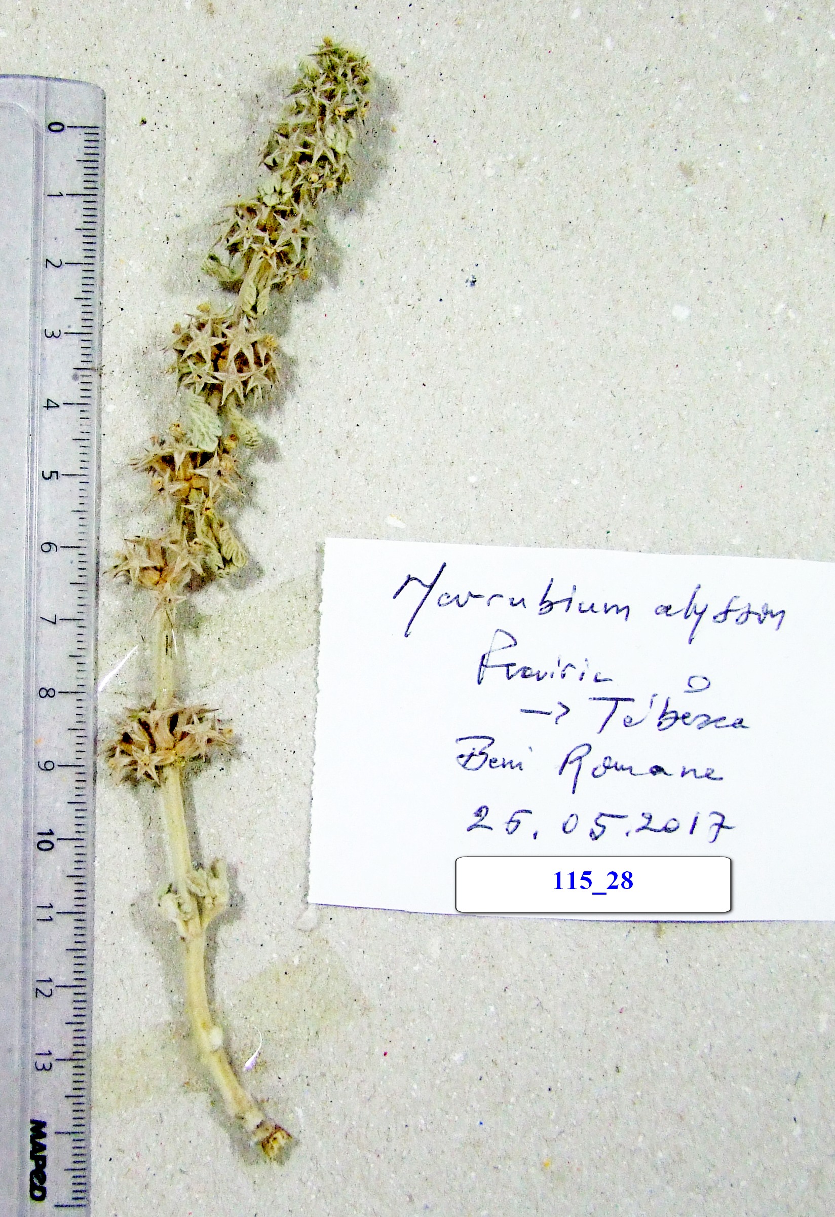 | 115_28 | Labiatae Marrubium alysson L. | x=8.198456 y=35.479158 z=1061 m | Tébessa pinède E (prairie) Tébessa 2017-05-26 |  |