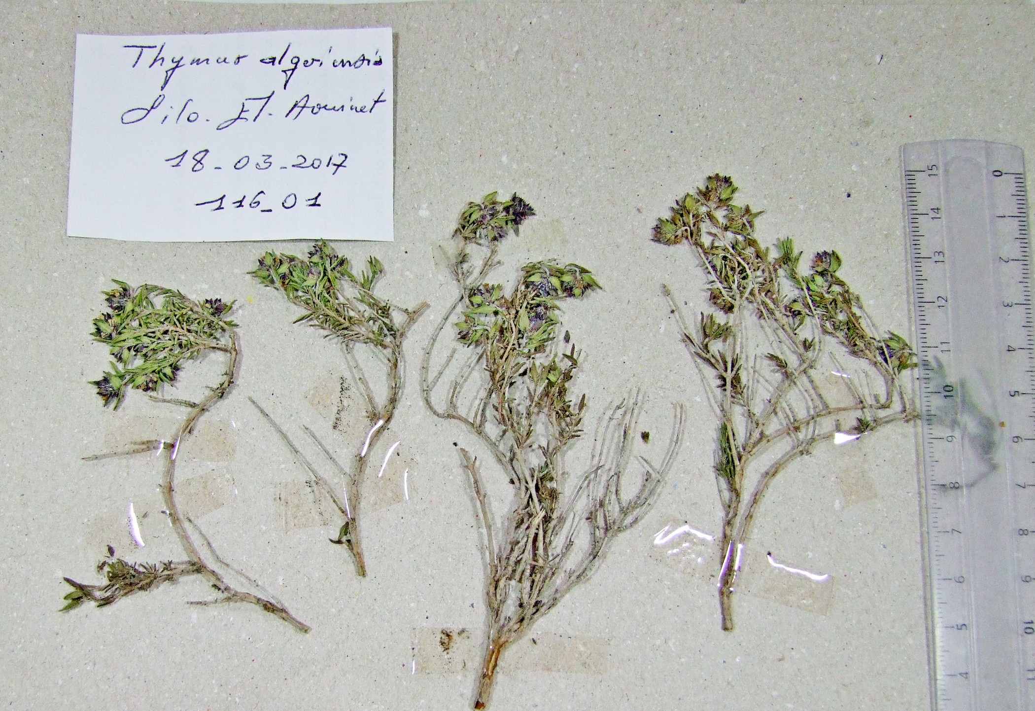 | 073_17 | Labiatae Thymus algeriensis Boiss. & Reut. | x=7.99975 y=36.206111 z=697 m | oued Djedra Souk Ahras 1993-03-26 | |