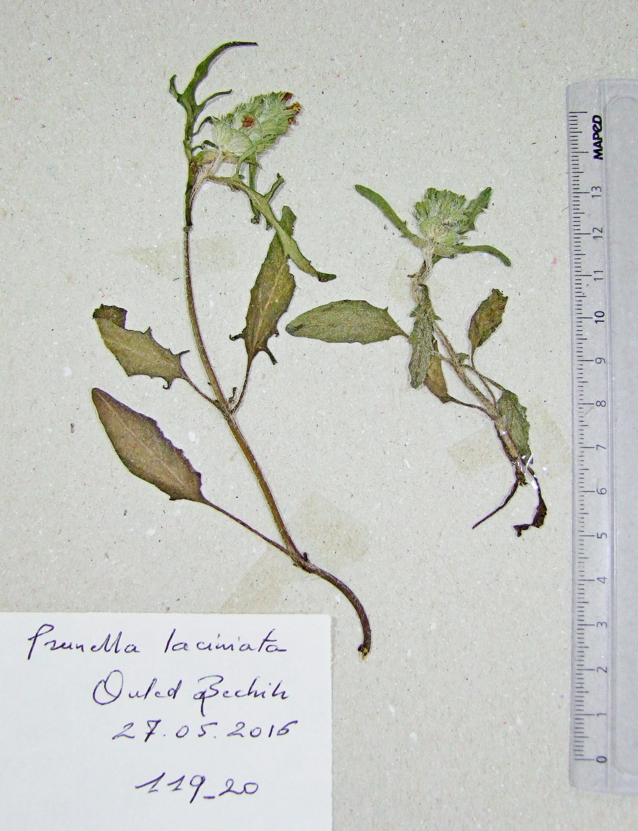 | 119_20 | Labiatae Prunella laciniata (L.) L. | x=7.876194 y=36.379694 z=987 m | Ouled Bechih (stat.à Sambucus) Souk Ahras 2016-05-27 |  |