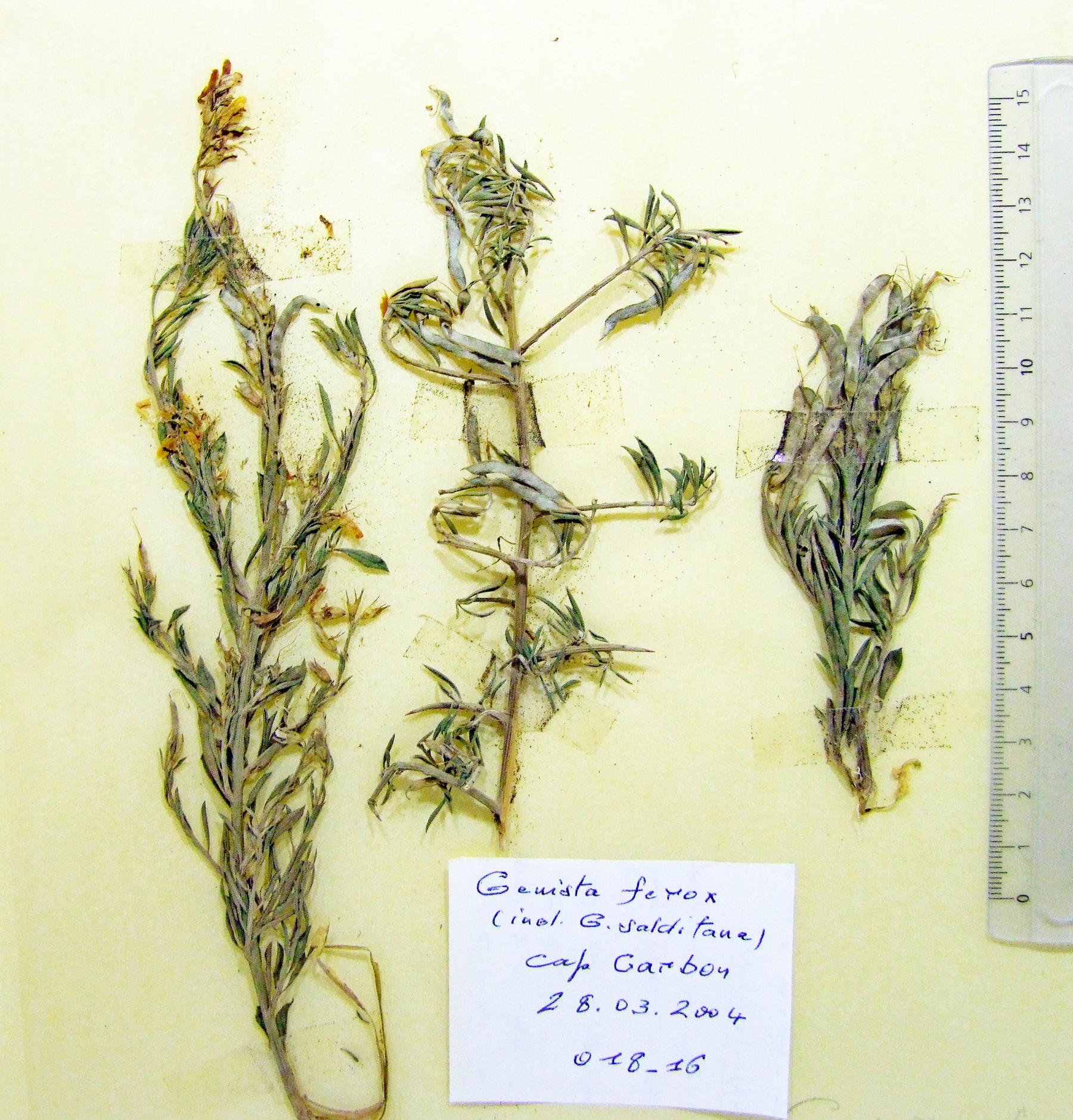| 018_13 | Leguminosae Genista ferox (Poiret) Dum. Cours | x=8.236522 y=36.979114 z=107 m | cap Rosa El Tarf 2003-08-26 | |