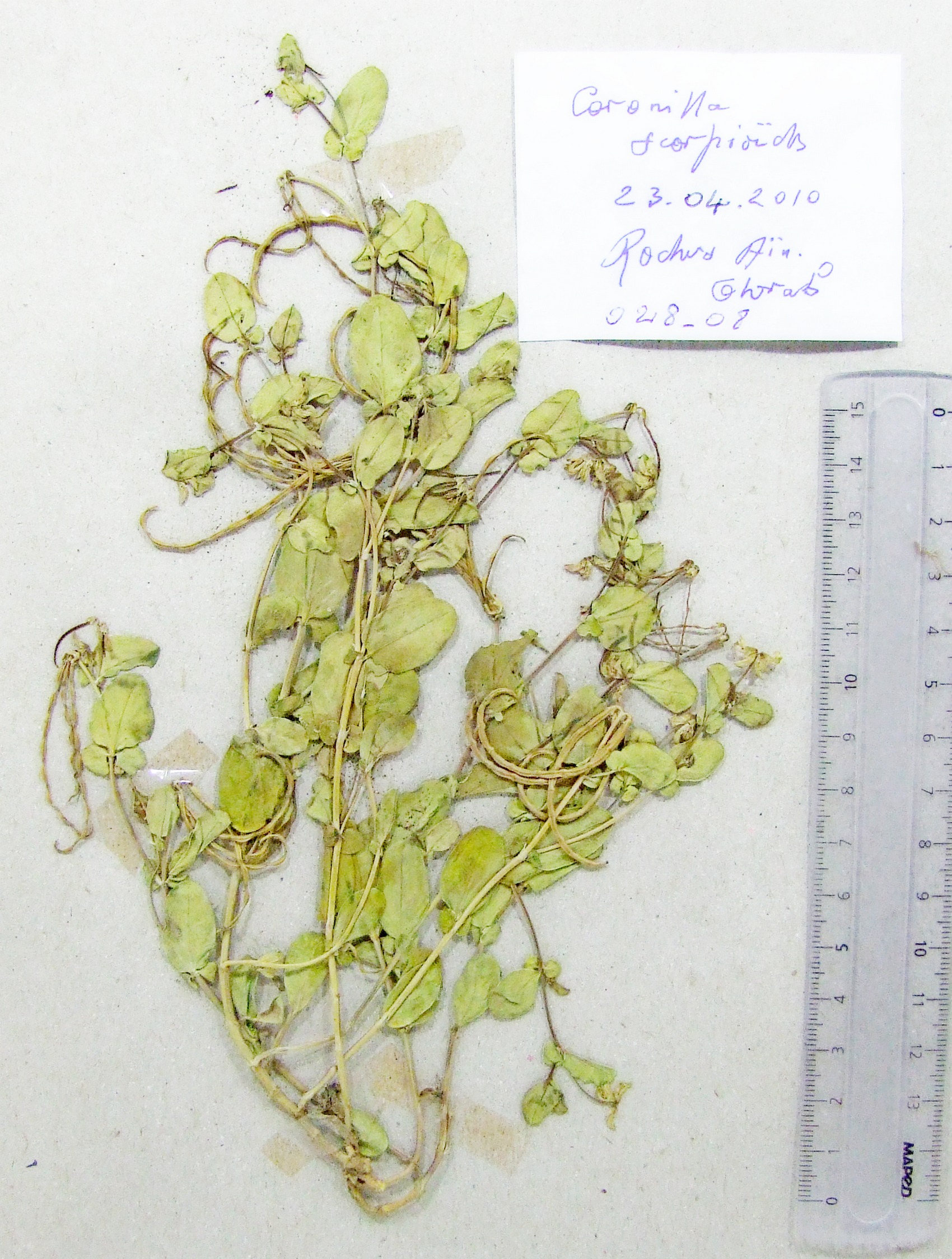 | 028_08 | Leguminosae Coronilla scorpioides (L.) Koch | x=8.050833 y=36.366194 z=1061 m | Aïn Ghorab Souk Ahras 2010-04-23 |  |