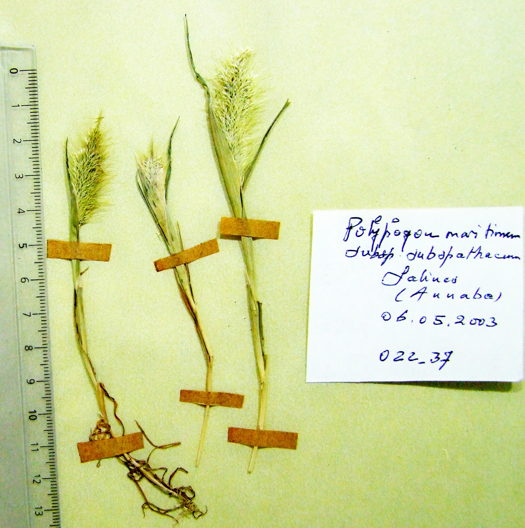 | 090_23 | Poaceae Alopecurus bulbosus Gouan subsp. macrostachyus (Poiret) Trab. | x=8.523444 y=36.881306 z=3 m | lac Tonga El Tarf 1988-05-29 | |