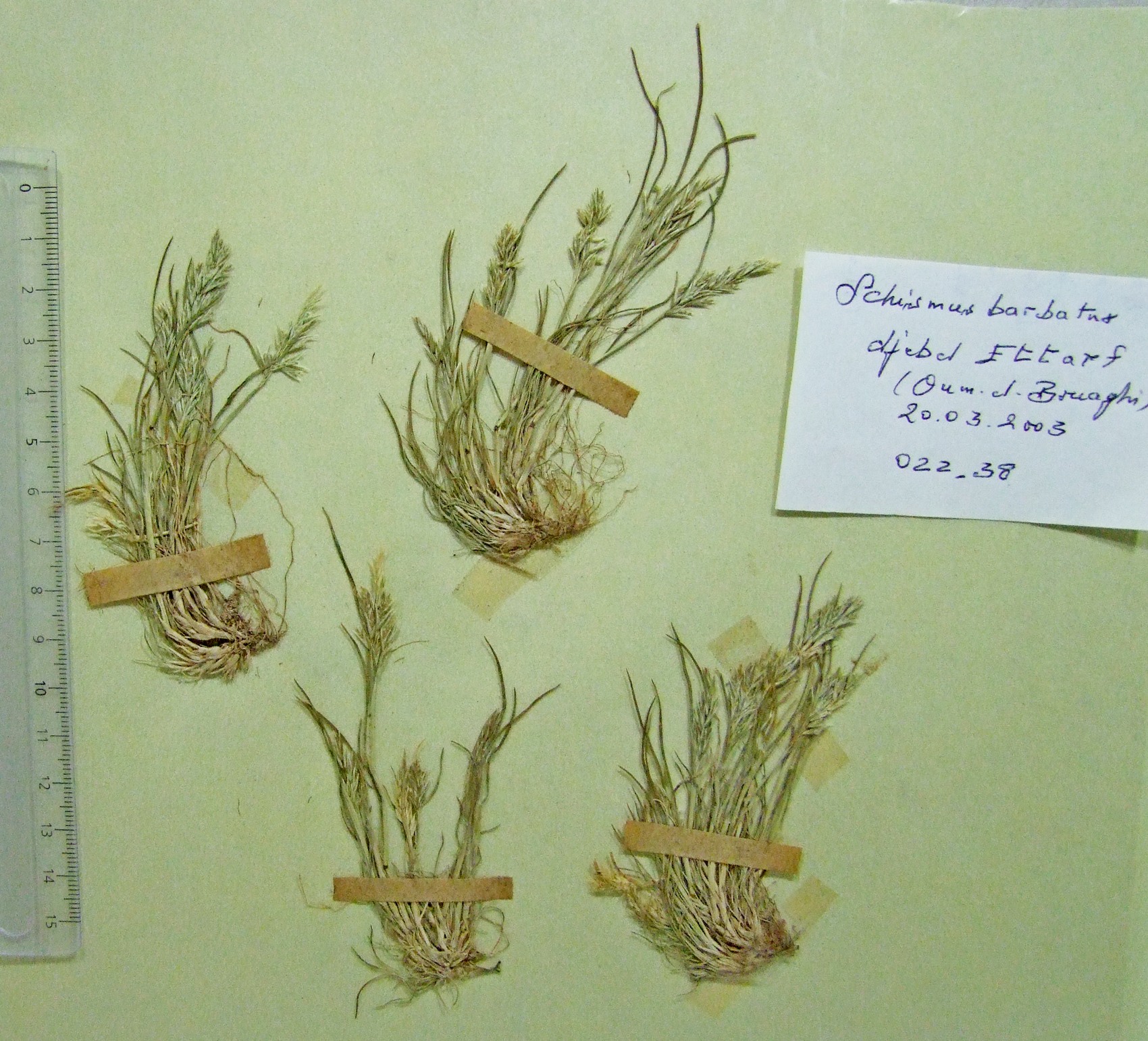 | 022_38 | Poaceae Schismus barbatus (Loefl. ex L.) Thell. subsp. barbatus | x=7.033425 y=35.719328 z=901 m | djebel Ettarf Oum el Bouaghi 1972-11-11 |  |