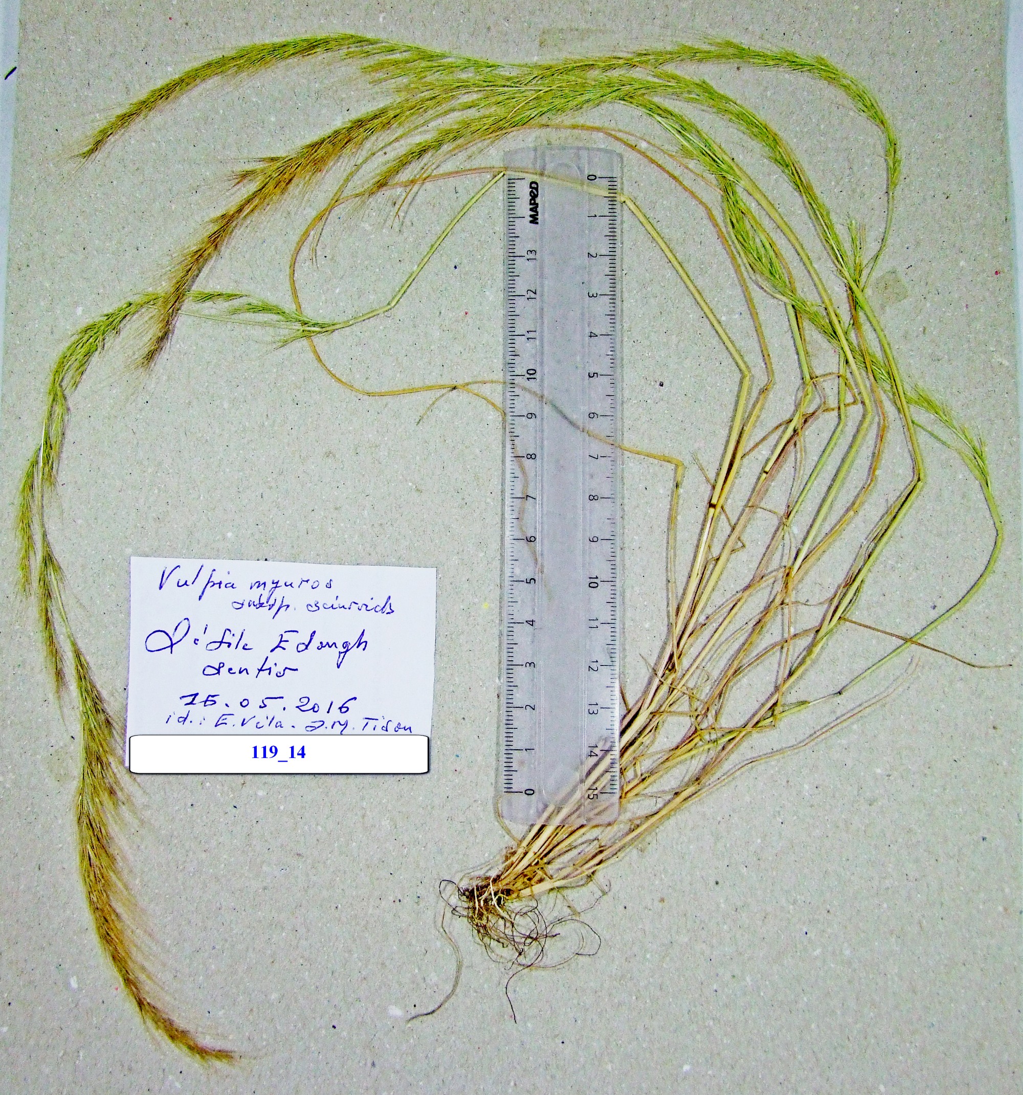 | 119_14 | Poaceae Vulpia myuros (L.) C.C. Gmel. subsp. sciuroides (Roth.) Rouy | x=7.633556 y=36.910111 z=838 m | défilé djebel Edough Annaba 2016-05-16 |  |