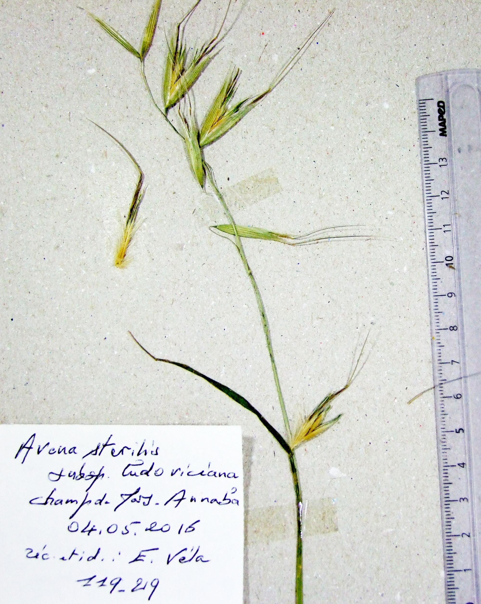 | 119_29 | Poaceae Avena sterilis L. subsp.ludoviciana (Durieu) Gillet & Magne | x=7.755708 y=36.895753 z=6 m | Annaba: champ de mars - place FLN Annaba 2016-05-04 |  |