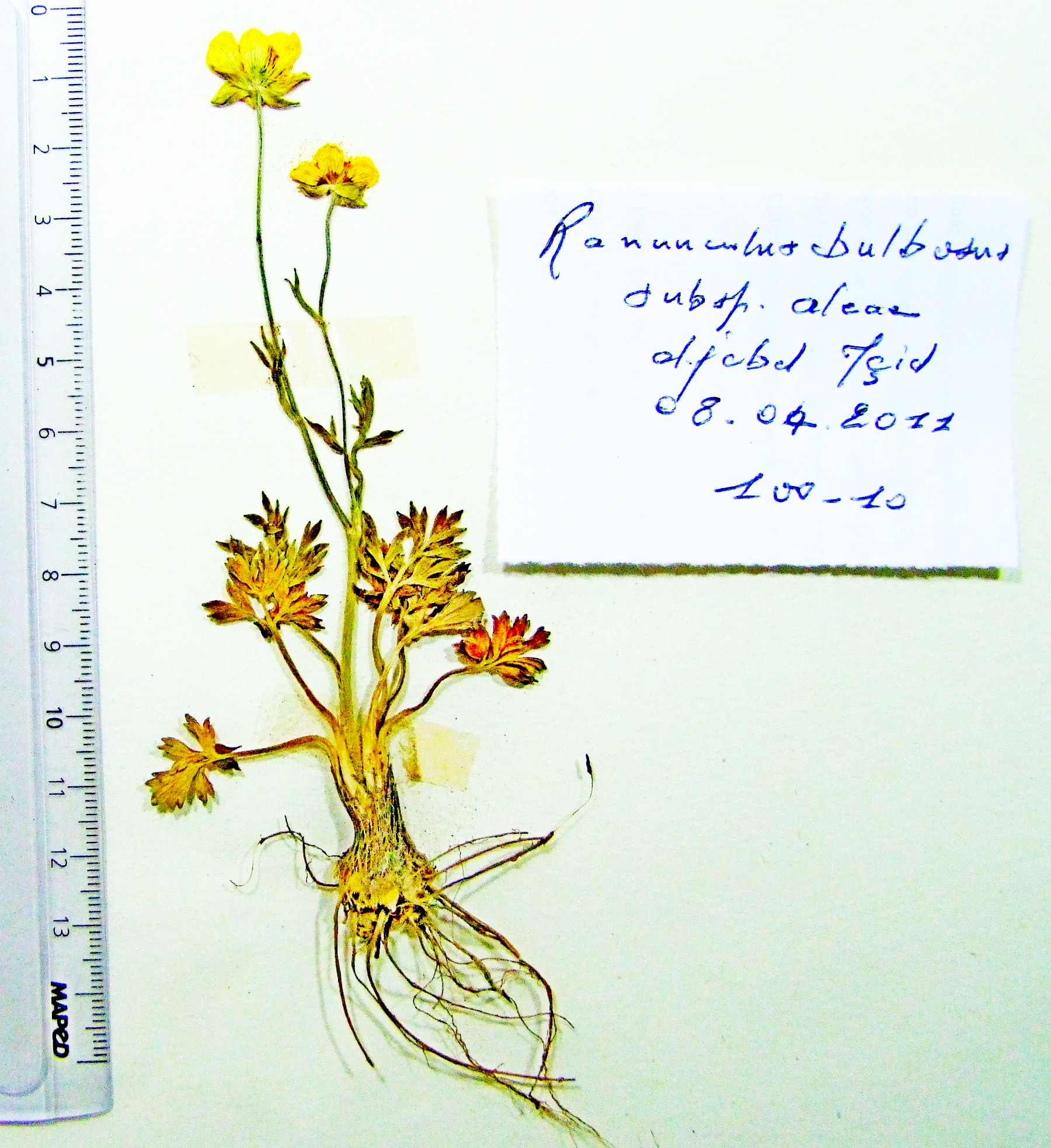 | 100_10 | Ranunculaceae Ranunculus bulbosus L. subsp. aleae (Willk.) Rouy & Fouc. | x=8.052444 y=36.395111 z=1380 m | djebel Mçid 1 Souk Ahras 2011-04-08 |  |