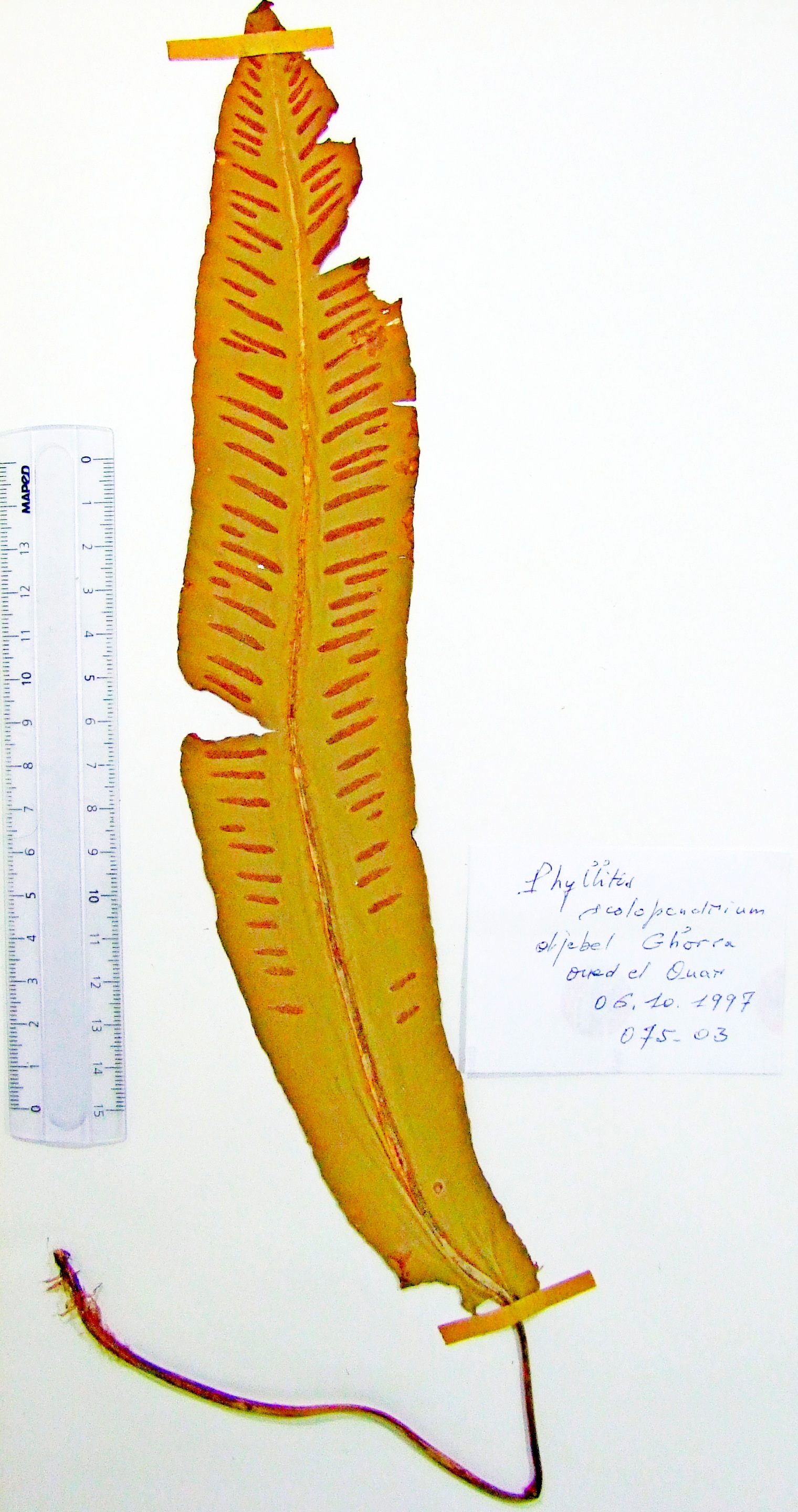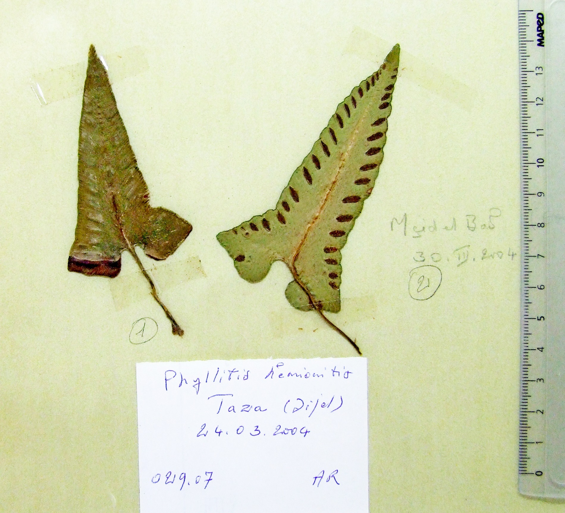 | 075_03 | Aspleniaceae Asplenium scolopendrium L. | x=8.3845 y=36.606783 z=974 m | djebel Ghorra El Tarf 1997-10-06 |  |
