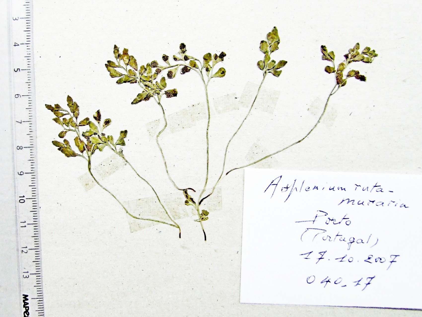 | 040_17 | Aspleniaceae Asplenium ruta-muraria L. | x=-8.606864 y=41.115933 z=152 m | Porto (Portugal) 2007-10-17 |  |