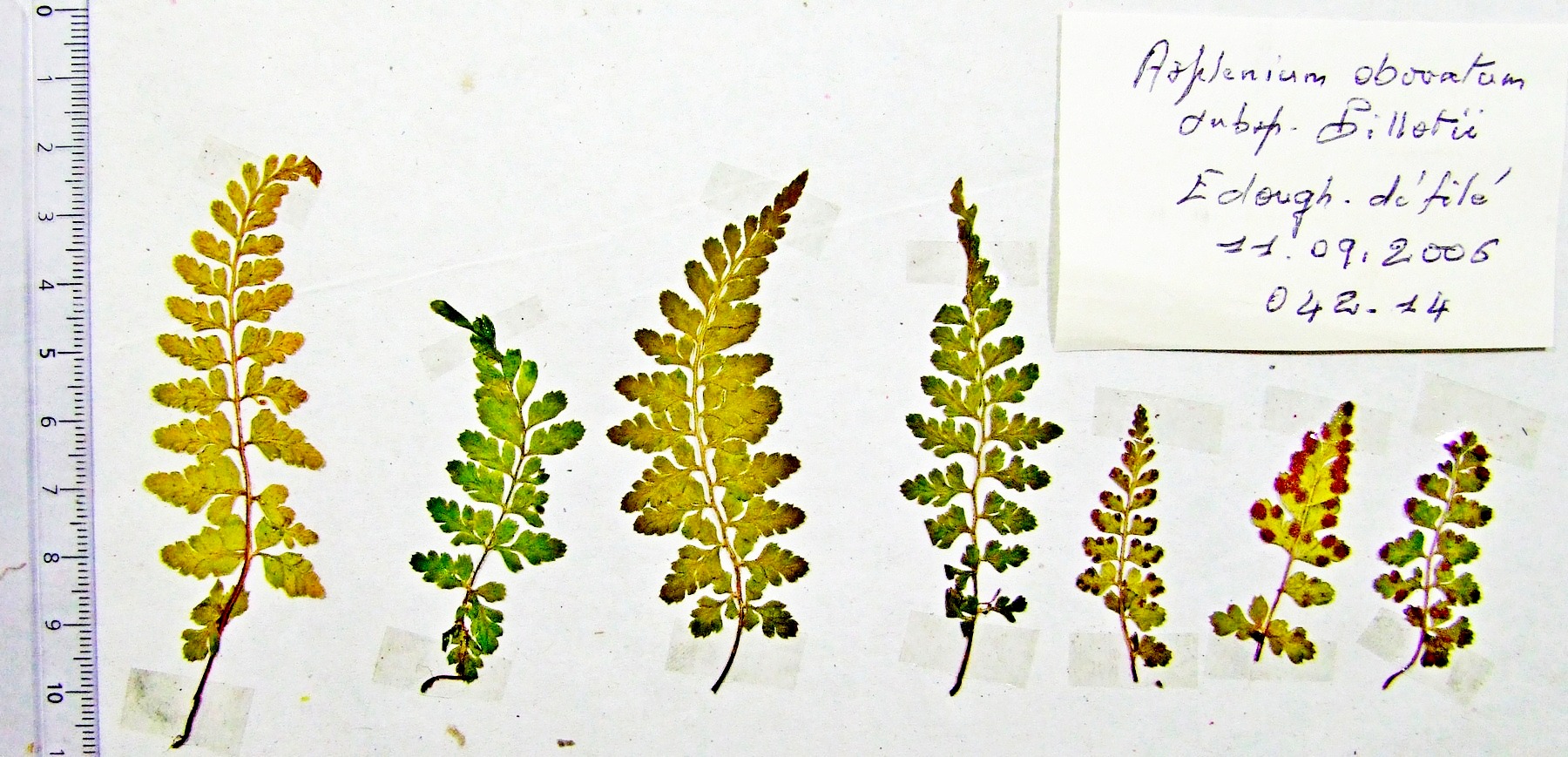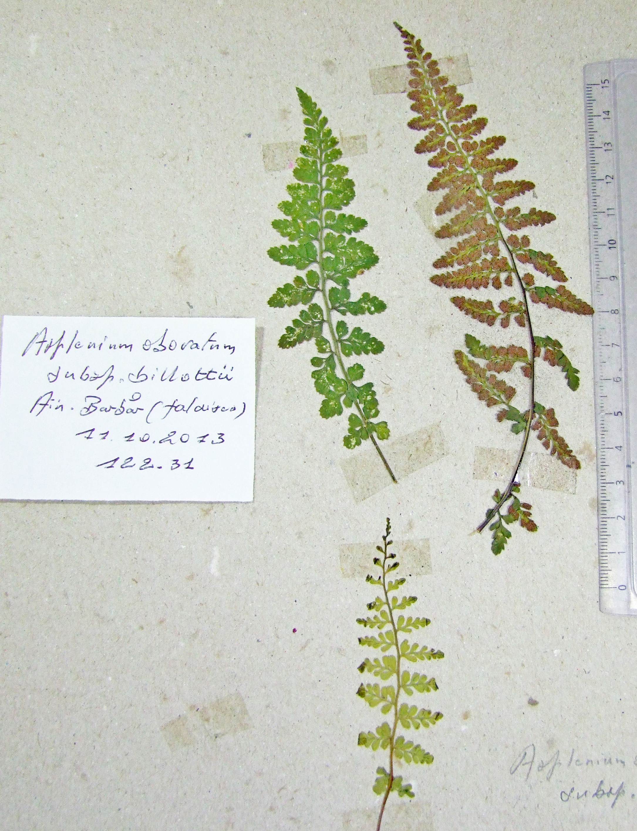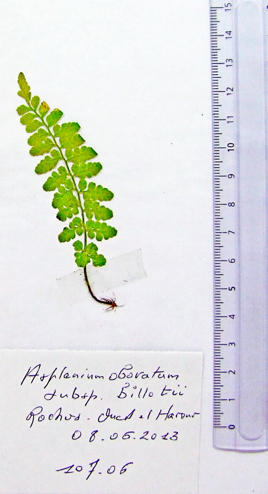 | 104_30 | Aspleniaceae Asplenium obovatum Viv. subsp. billotii (F.W. Schlutz) O. Bolos, Vigo, Masalles & Ninot | x=7.633556 y=36.910111 z=838 m | défilé djebel Edough Annaba 2012-05-19 | |