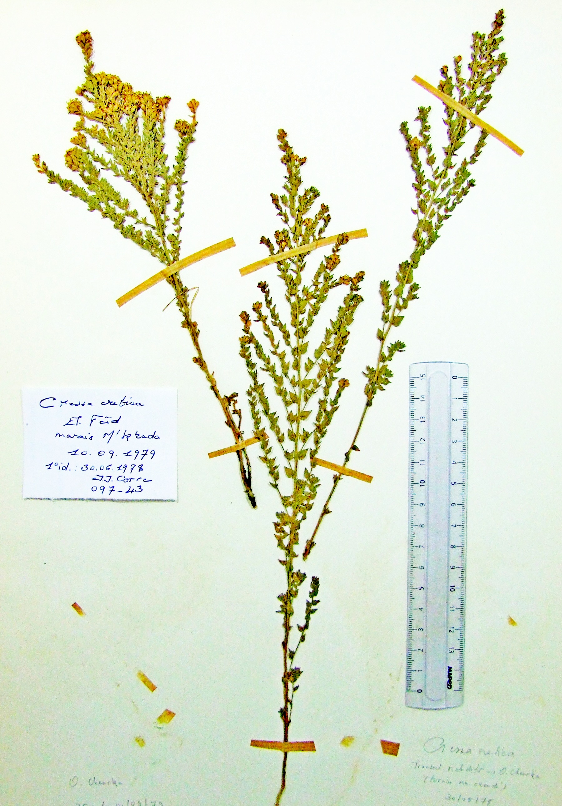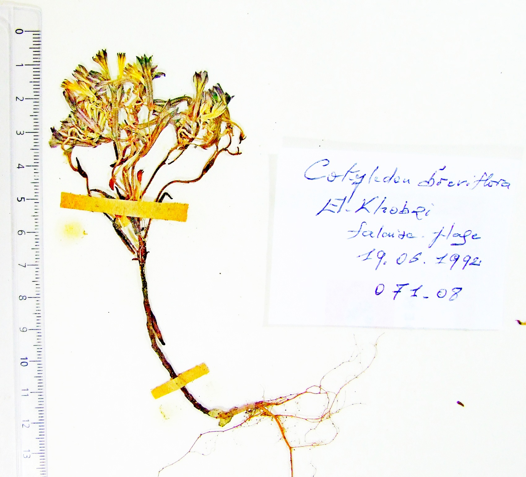 | 071_09 | Crassulaceae Pistorinia breviflora Boiss. subsp. breviflora | x=8.297194 y=36.913619 z=17 m | dunes lac Mellah W El Tarf 1988-06-24 | |