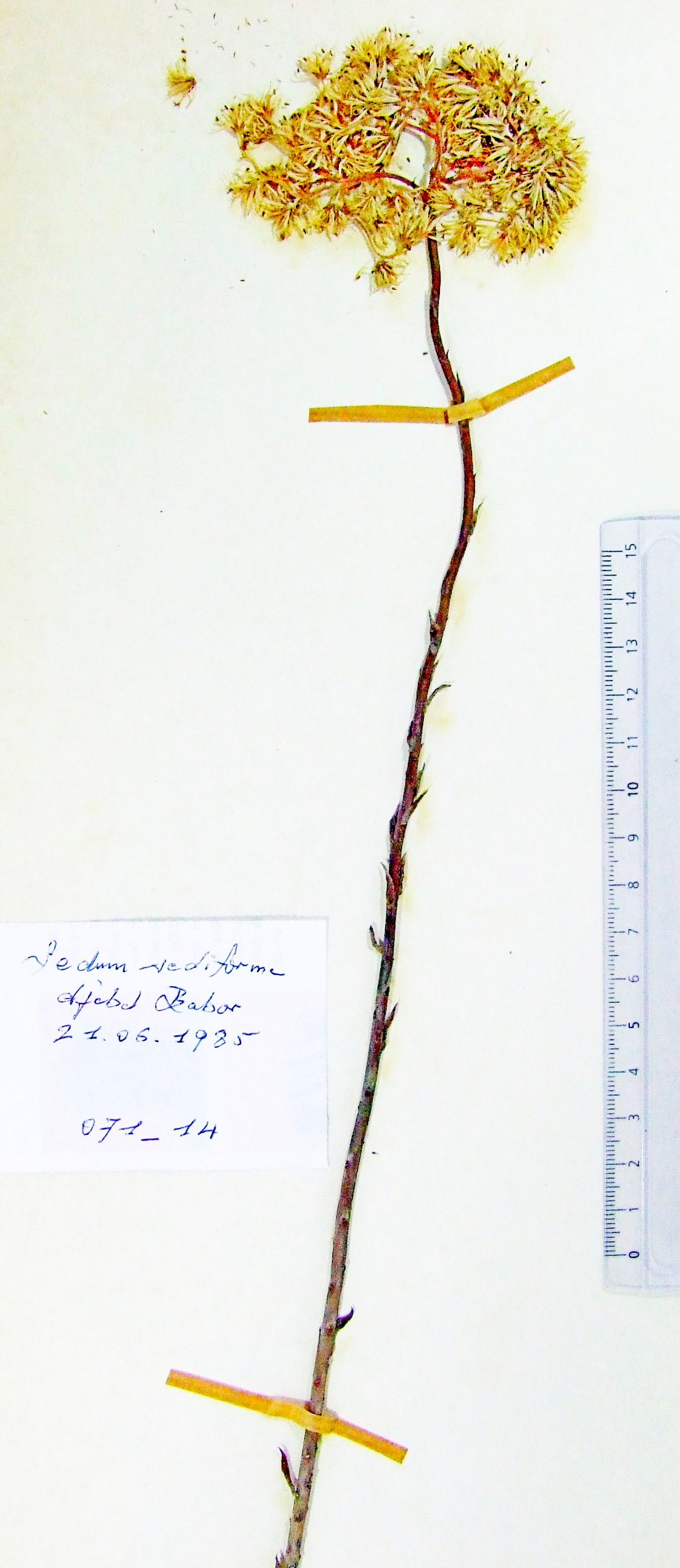 | 071_14 | Crassulaceae Sedum sediforme (Jacq.) Pau | x=5.455072 y=36.493397 z=1855 m | djebel Babor Sétif 1985-05-21 |  |