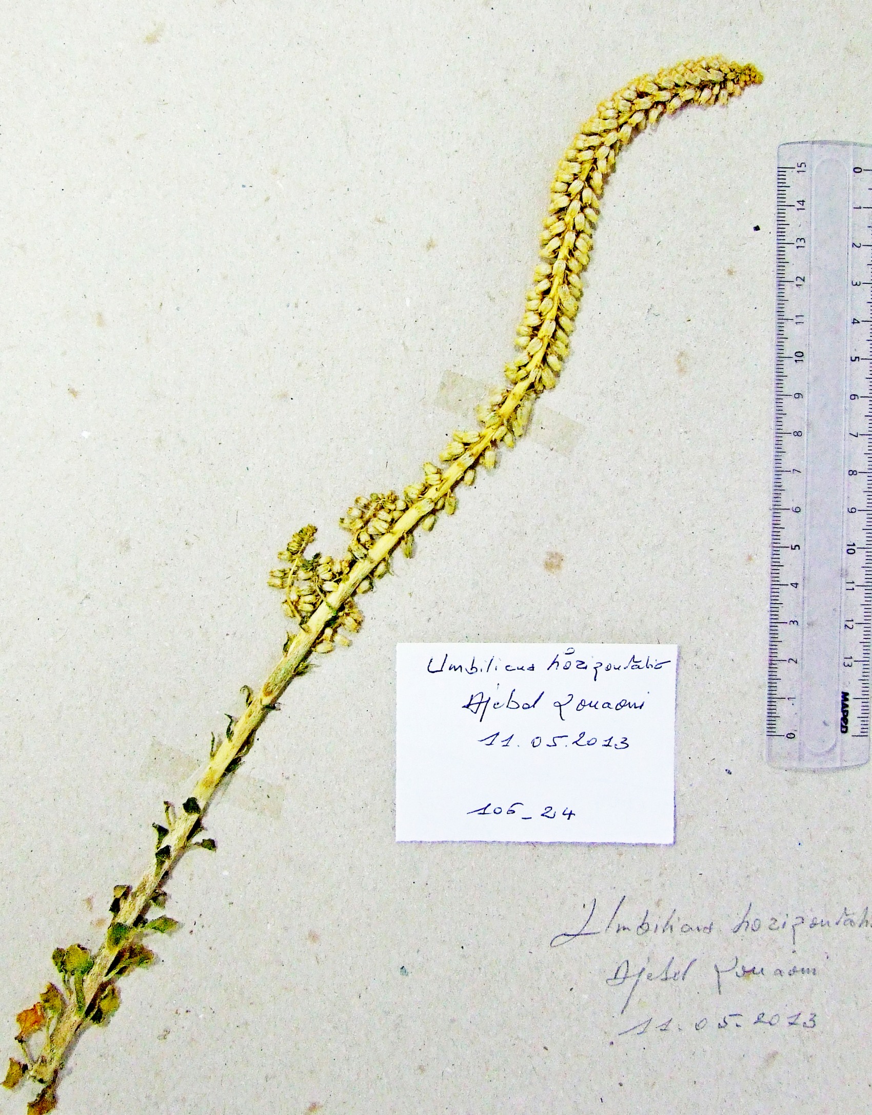 | 106_24 | Crassulaceae Umbilicus horizontalis (Guss.) DC. | x=6.463389 y=36.352444 z=962 m | djebel Zouaoui Constantine 2013-05-11 |  |