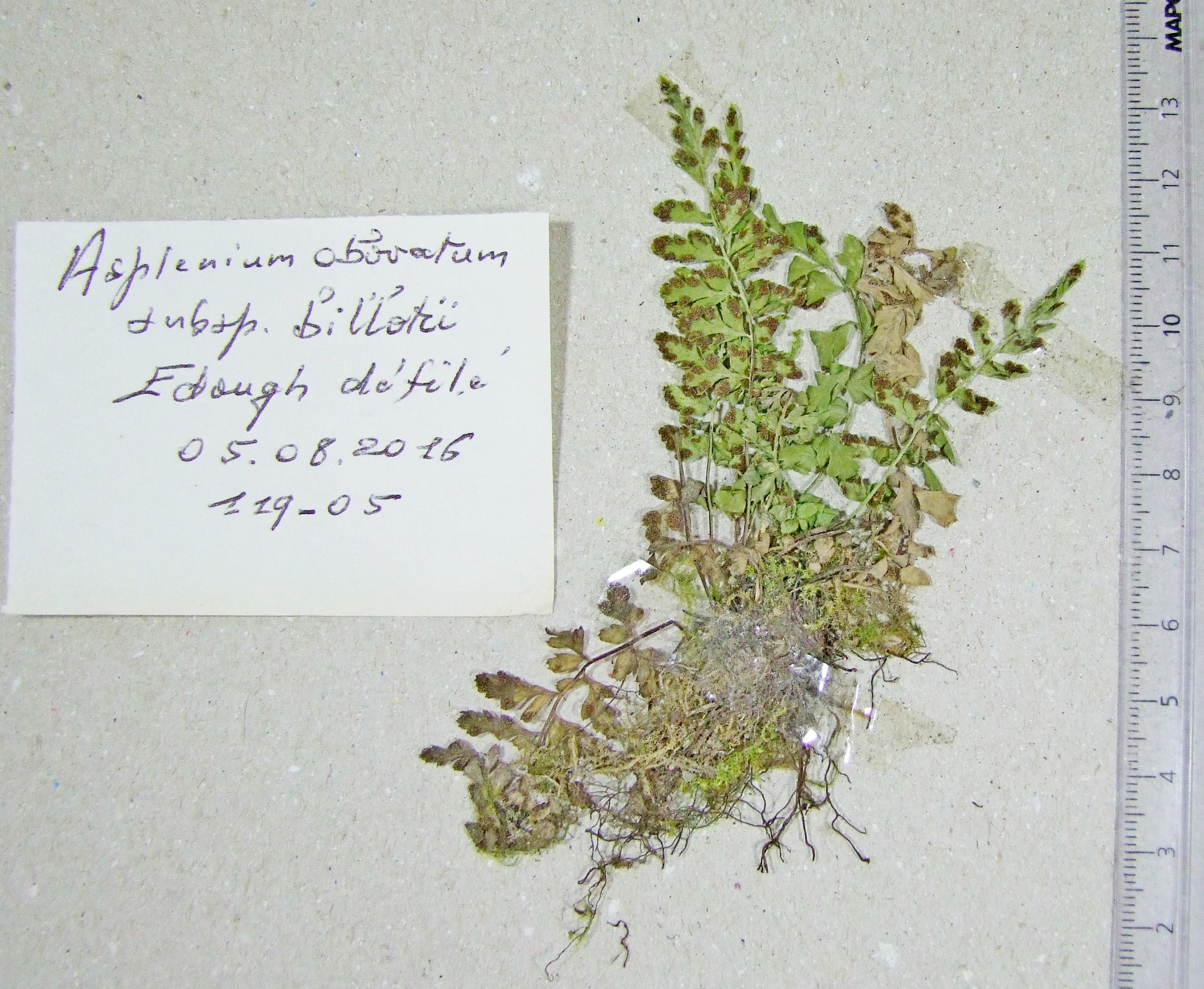 | 119_05 | Aspleniaceae Asplenium obovatum Viv. subsp. billotii (F.W. Schlutz) O. Bolos, Vigo, Masalles & Ninot | x=7.633556 y=36.910111 z=838 m | défilé djebel Edough Annaba 2016-08-05 |  |