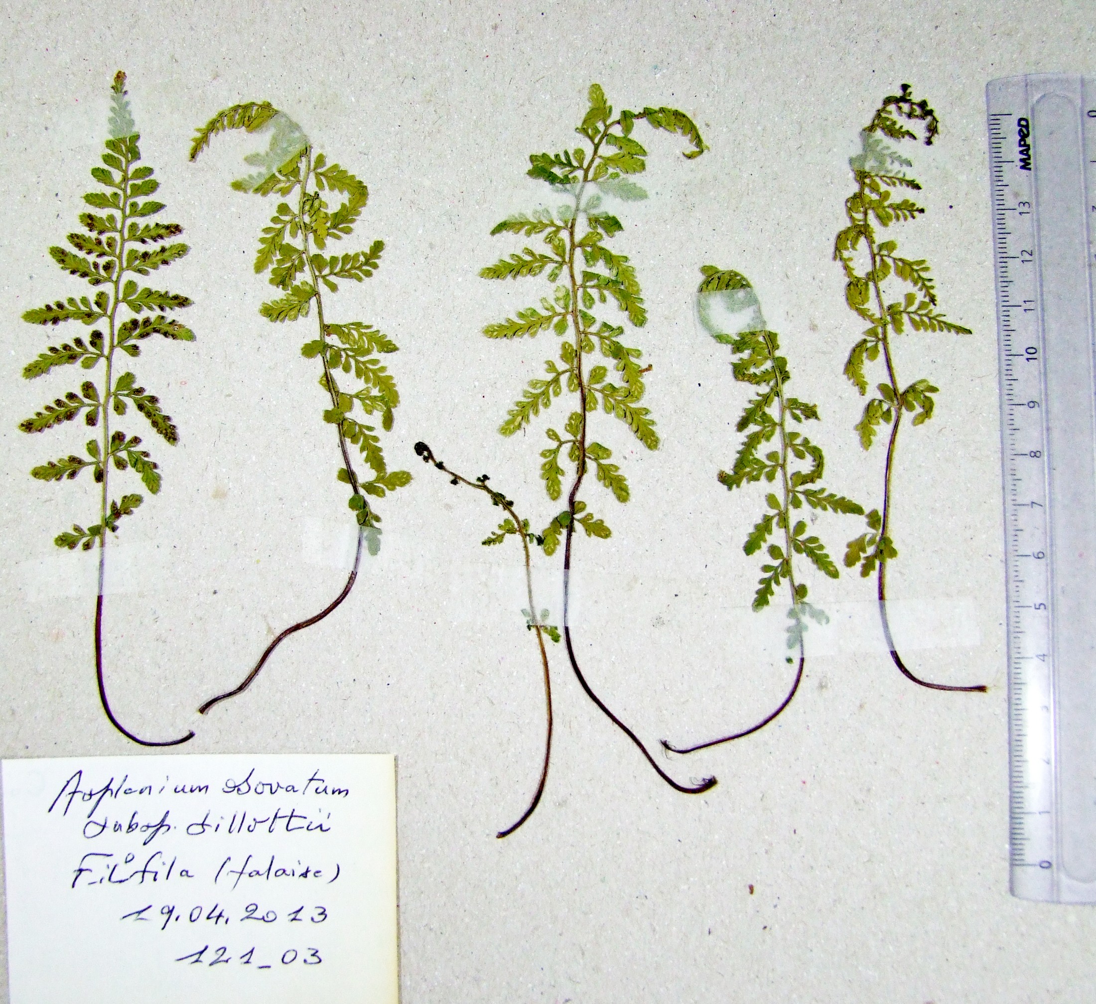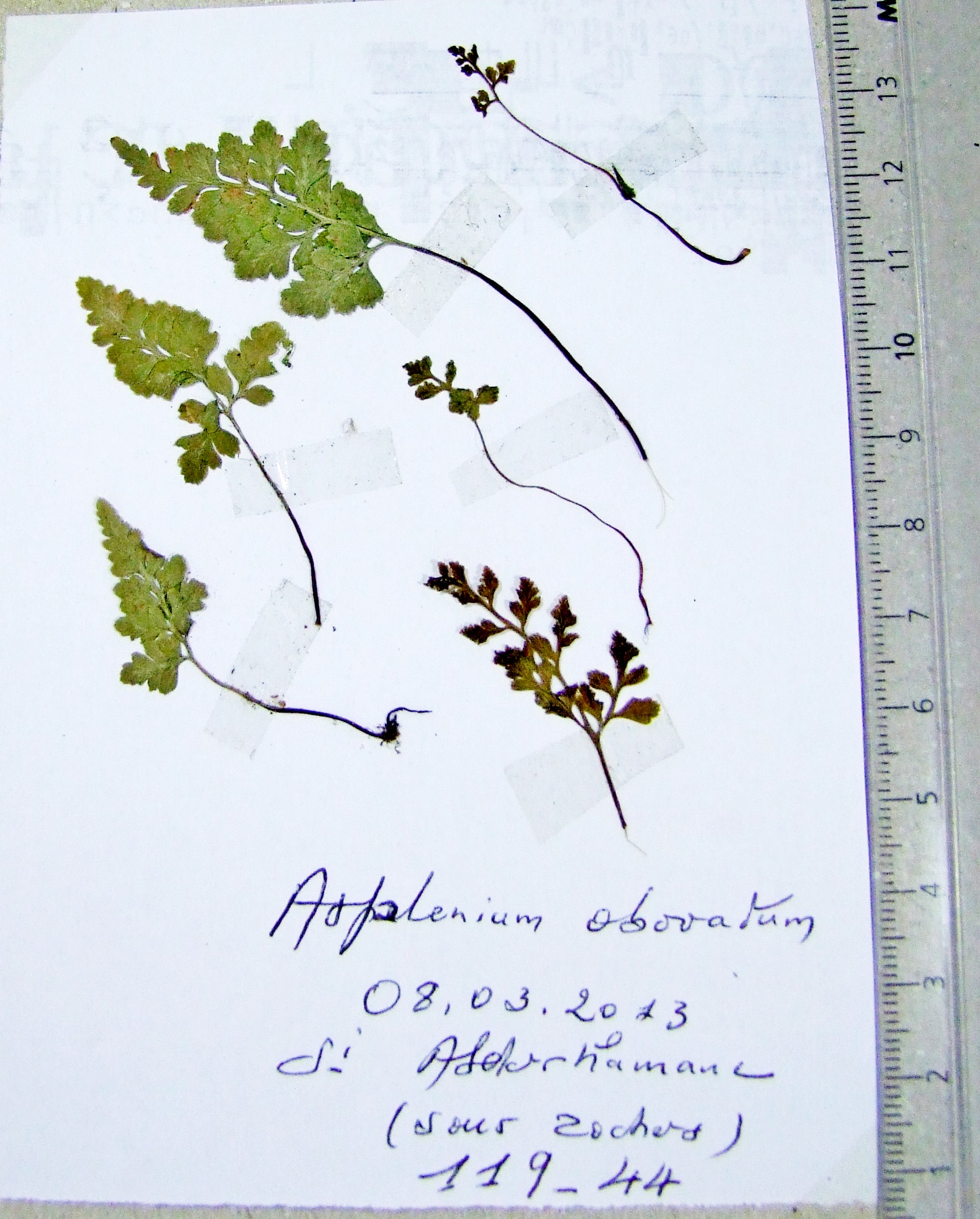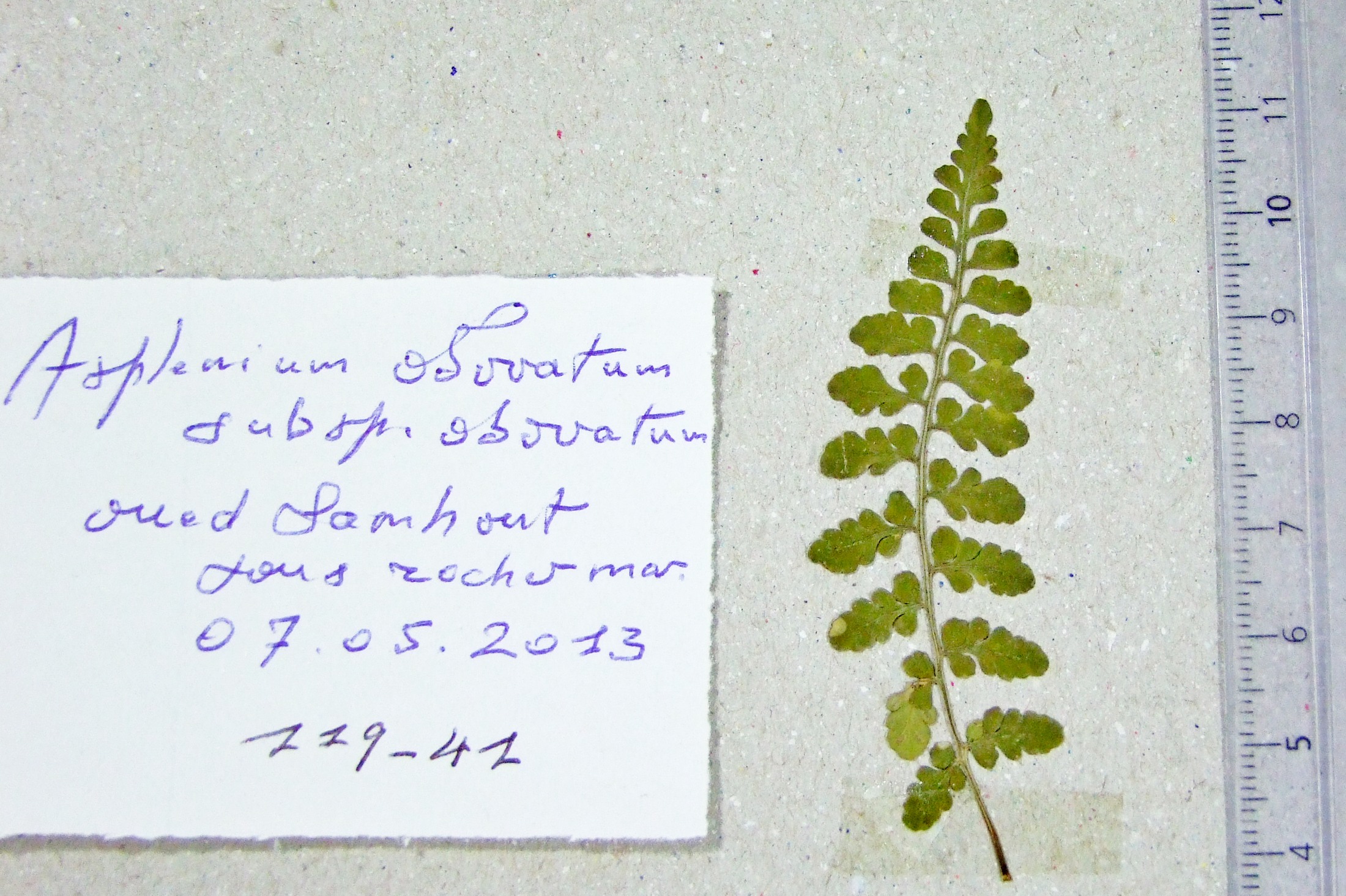 | 121_03 | Aspleniaceae Asplenium obovatum Viv. subsp. billotii (F.W. Schlutz) O. Bolos, Vigo, Masalles & Ninot | x=7.100356 y=36.888217 z=289 m | Filfila 7 Skikda 2013-04-19 |  |