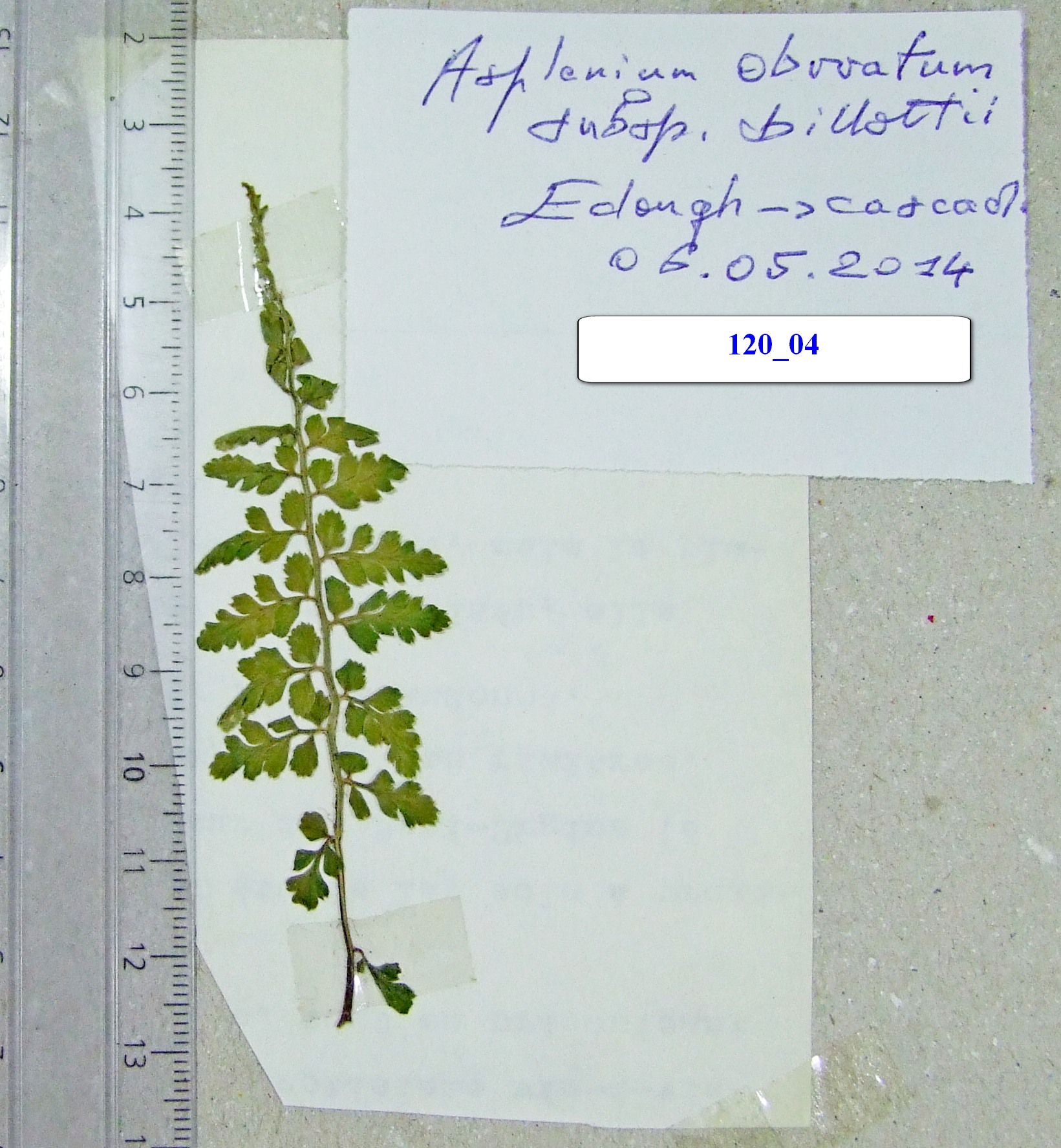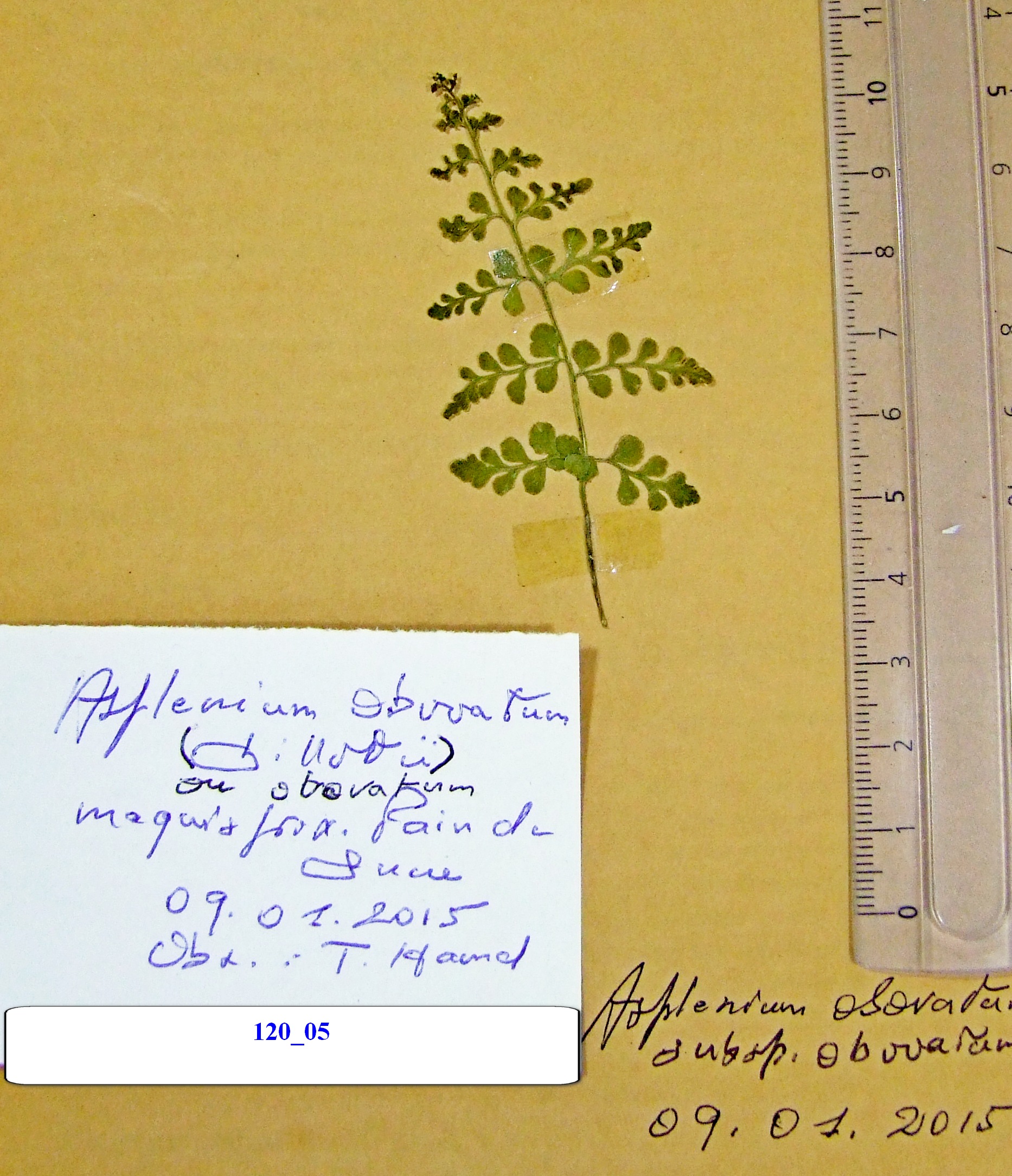 | 120_05 | Aspleniaceae Asplenium obovatum Viv. subsp. billotii (F.W. Schlutz) O. Bolos, Vigo, Masalles & Ninot | x=7.155778 y=36.912972 z=492 m | Cascade Vautours Annaba 2014-05-06 |  |