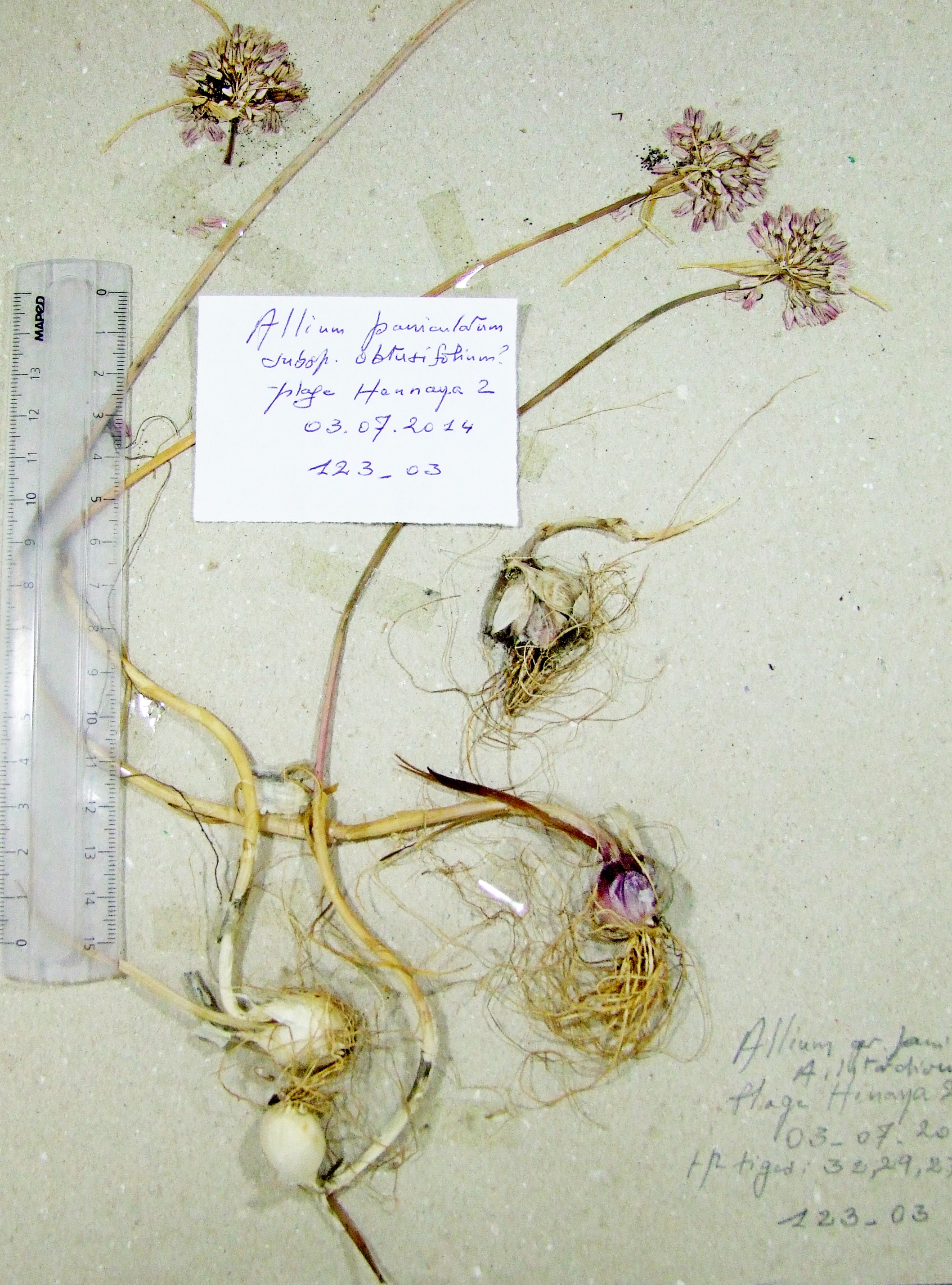 | 123_03 | Alliaceae Allium longispathum Redouté | x=8.130183 y=36.903686 z=5 m | plage Hennaya El Tarf 2014-07-03 |  |