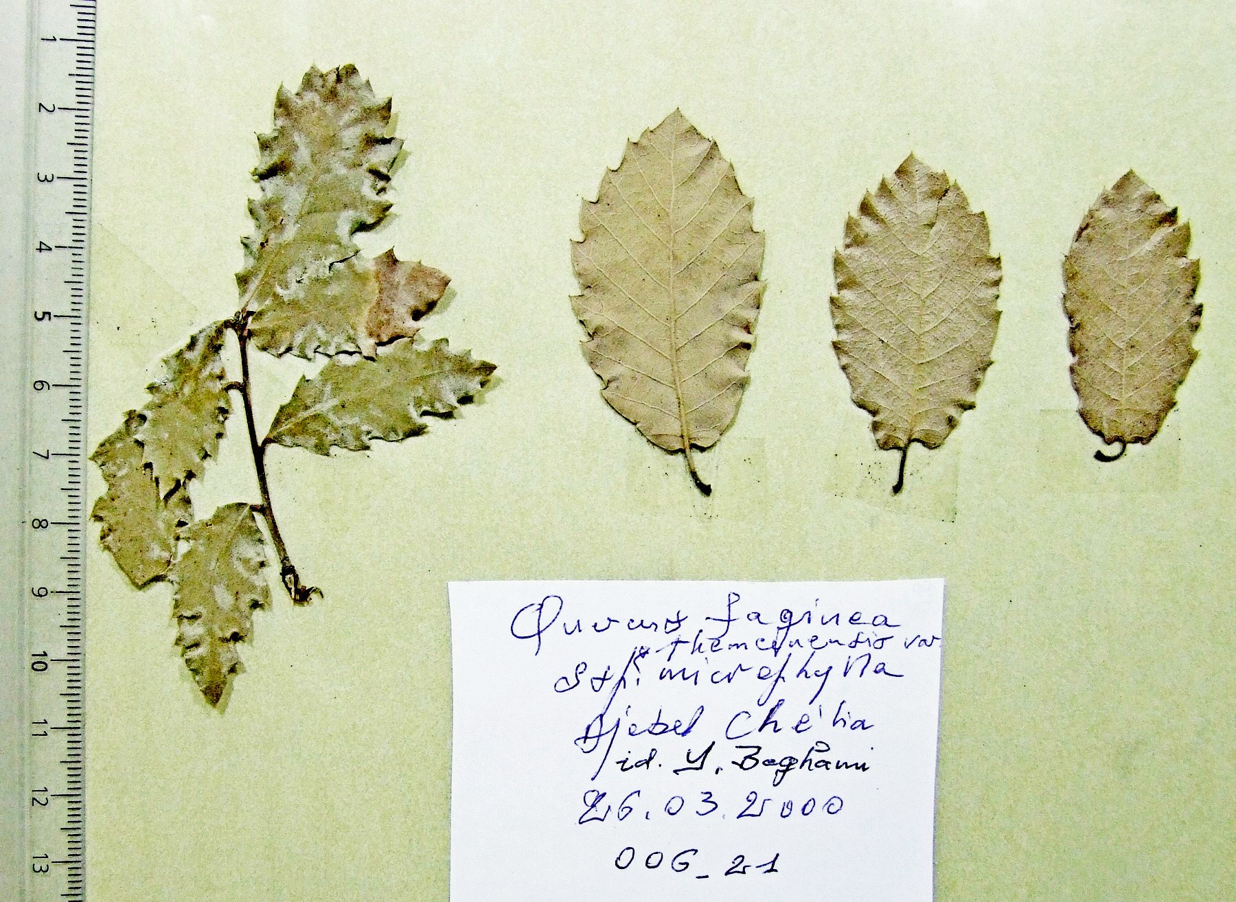 | 006_21 | Fagaceae Quercus faginea Lam. subsp. broteroi | x=6.980394 y=35.457664 z=1008 m | djebel Ouled Yakoub Khenchela 2000-03-26 |  |