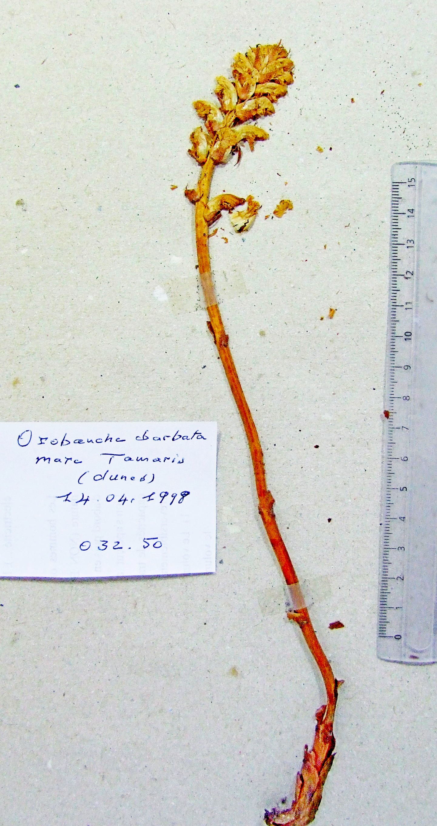 | 032_50 | Orobanchaceae Orobanche minor Sm. | x=8.076303 y=36.852625 z=38 m | mare Tamaris El Tarf 1998-04-14 |  |