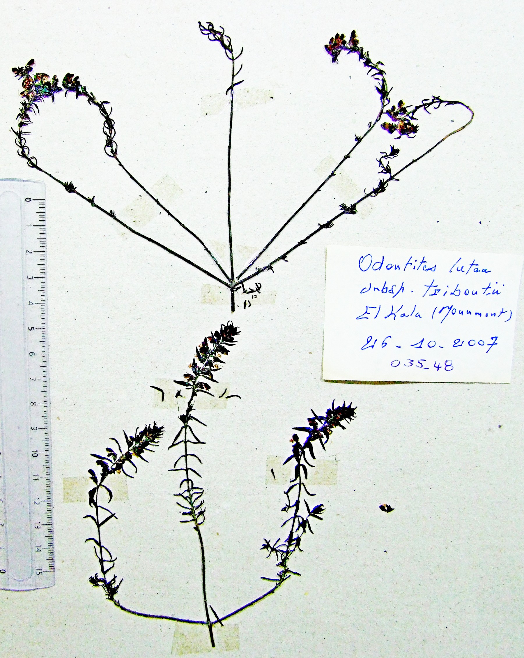| 101_43 | Orobanchaceae Odontites reboudii Gren. & Paillot | x=8.552528 y=36.78505 z=215 m | Roum el Souk NO El Tarf 2011-10-28 | |