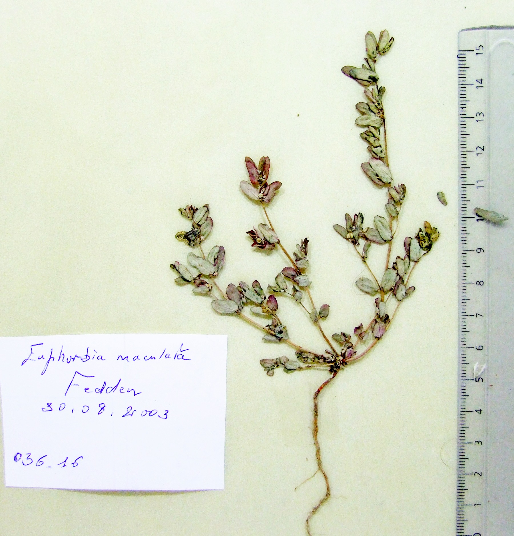 | 036_16 | Euphorbiaceae Chamaesyce maculata (L.) Small | x=8.420542 y=36.648969 z=629 m | Fedden El Tarf 2003-08-30 |  |