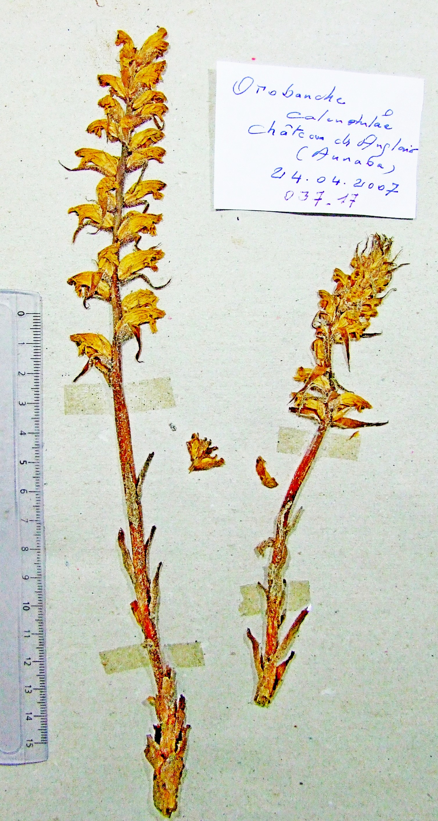 | 037_17 | Orobanchaceae Orobanche calendulae Pomel | x=7.771053 y=36.915464 z=12 m | château des Anglais Annaba 2007-04-24 |  |